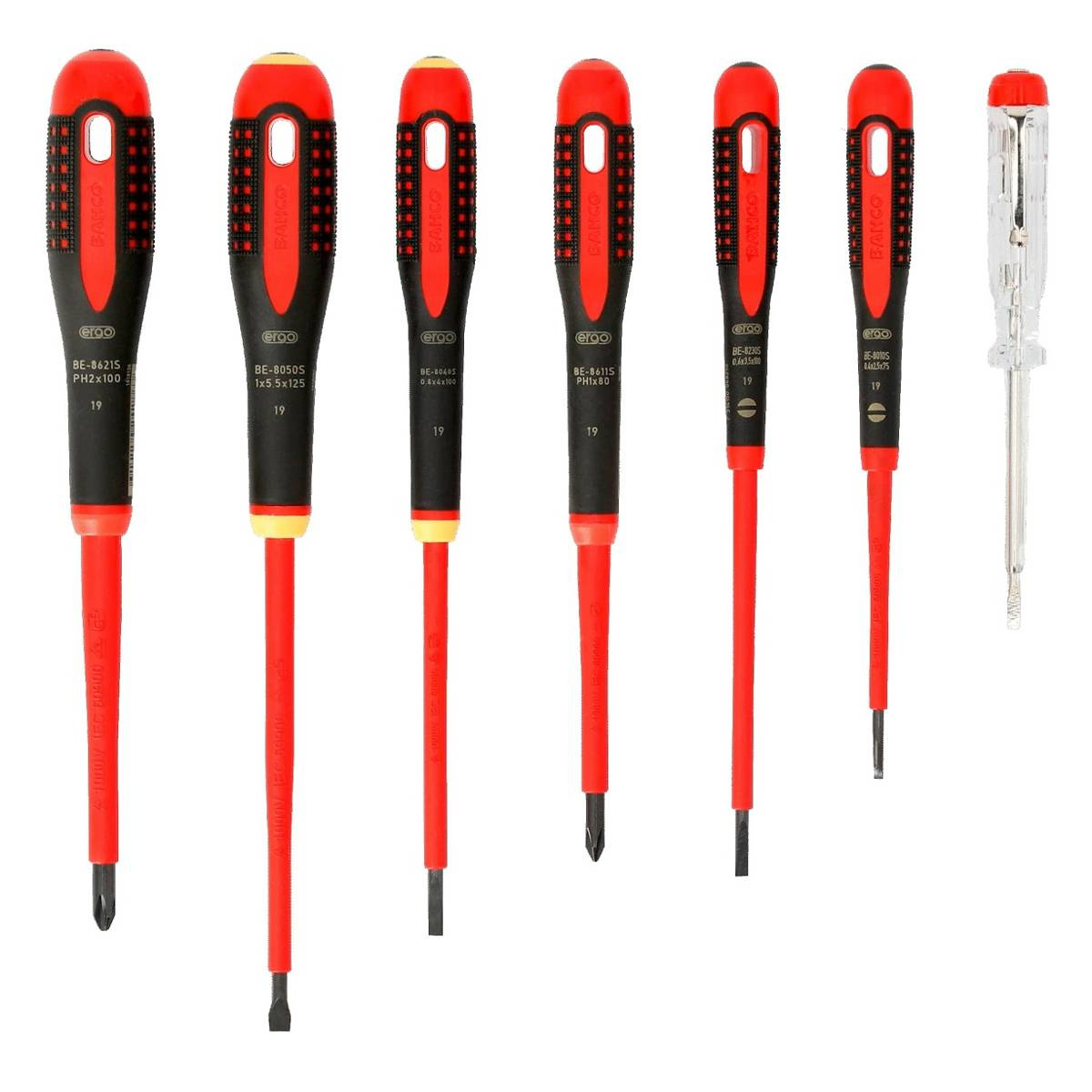 Zestaw wkrętaków izolowanych Bahco BE-9887S opracowane zostały zgodnie z technologią ERGO™ oraz indywidualnie sprawdzone w kąpieli wodnej po napięciem 10000 V i produkowane zgodnie z normą IEC60900. Wysokiej jakości izolacja uformowana bezpośrednio na grocie zapewnia możliwość pracy pod napięciem przemiennym do 1000 V. Trzy komponentowa rękojeść wkrętaków, wykonana została z miękkich materiałów, które zapewniają maksymalny komfort pracy przy nie wielkim wysiłku. W skład zestawu wchodzi również próbnik, pozwalający na wskazanie napięcia w zakresie 150 - 250 V.
