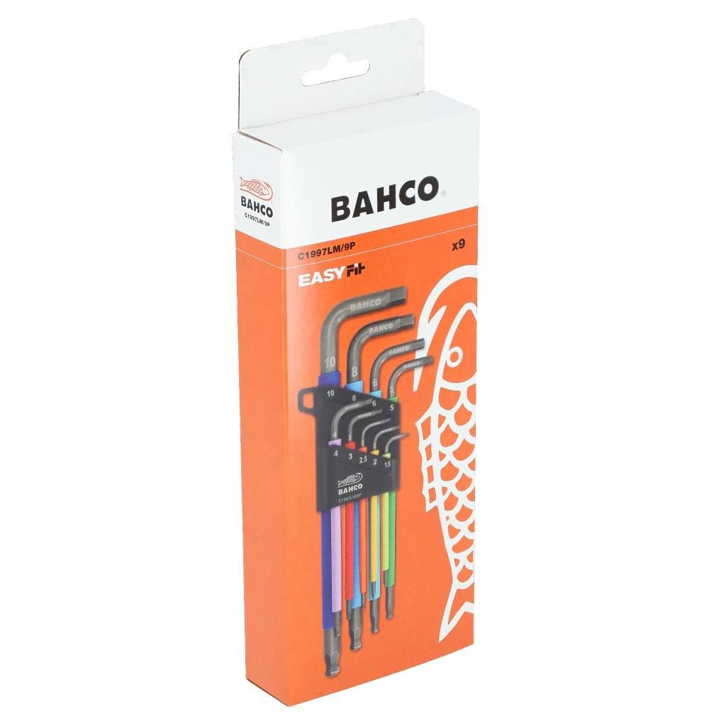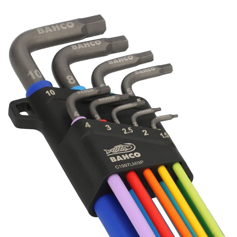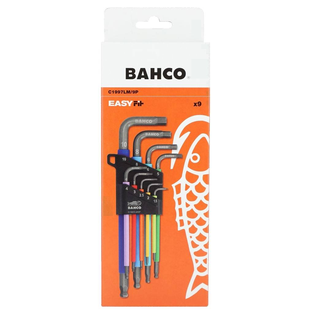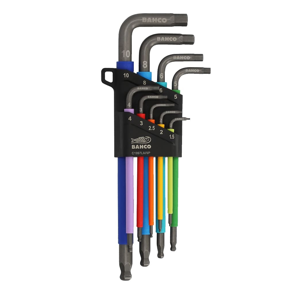 Zestaw kluczy imbusowych Bahco C1997LM/9P to zestaw długich, kolorowych kluczy zaprojektowanych zgodnie z technologią ERGO o kształcie końcówki sześciokątnej. Wykonane z wysokiej jakości stali hartowanej o fosforanowym wykończeniu, dodatkowo zabezpieczającym przed korodowaniem. Długie ramię kluczy Bahco C1997LM/9P pozwala lepiej przenosić moment obrotowy, kosztem mniejszego wysiłku. Główka kulista zastosowana po jednej stronie klucza pozwala na wygodną pracę pod kątem.