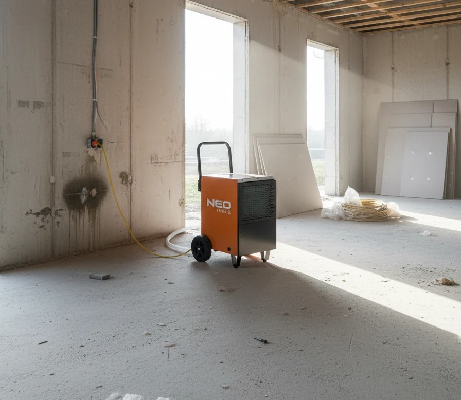 Osuszacz budowlany Neo Tools 90-160 to urządzenie przeznaczone do działań budowlano-przemysłowych, gdzie panują trudne warunki i wymagane są widoczne szybkie efekty. Urządzenie posiada moc znamionową na poziomie 750 W i zdolność odprowadzania, do 50 litrów wilgoci w ciągu 24h.