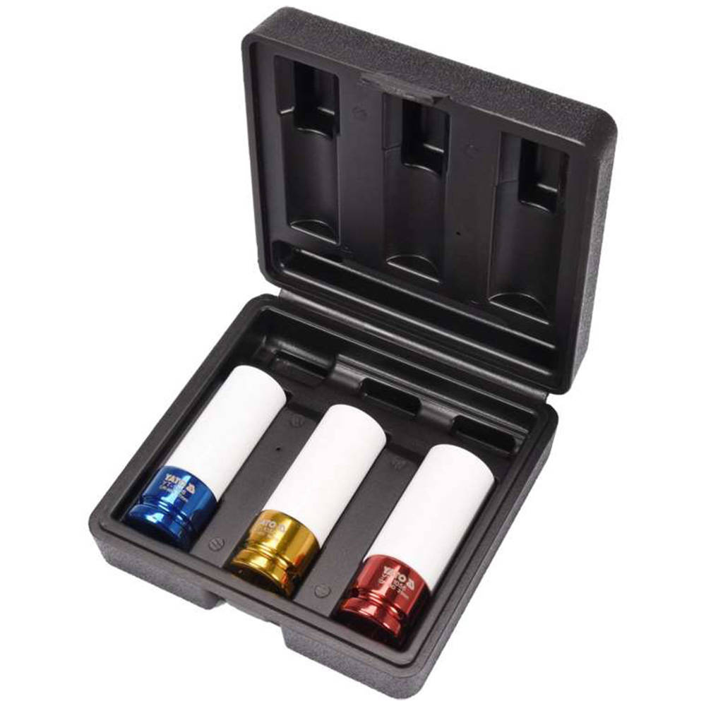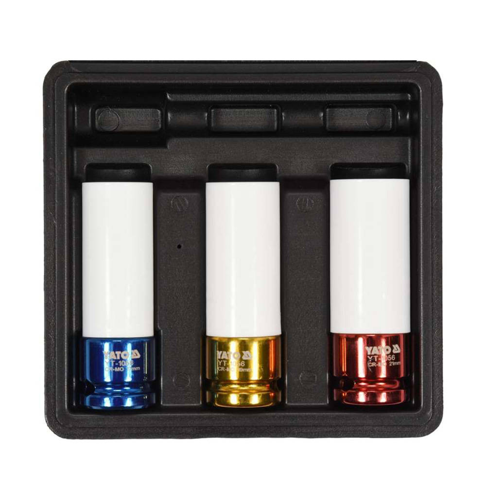 Yato YT-1056 to nasadki udarowe przeznaczone do odkręcania i przykręcania śrub do aluminiowych felg samochodowych. Nasadki charakteryzują się zewnętrzną powłoką wykonaną z tworzywa, która skutecznie chroni gniazda felg samochodowych przed zarysowaniem i uszkodzeniem. Ponadto nasadki zostały wykonane w różnej kolorystyce w celu łatwiejszej identyfikacji każdego z rozmiaru nasadki. Nasadki charakteryzują się cienką ścianką, które pozwalają na pracę w ciasnych gniazdach felg.