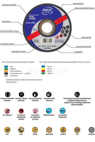 - Incoflex A46TBF - to tarcza do ciecia metalu, stali. Średnica zew. 125 mm, śred. wew. 22,23 mm, Grubość 1,6 mm. Ściernica płaska. Gatunek elektrokorund. Bardzo twarda. Zastosowanie ze szlifierką kątową.
