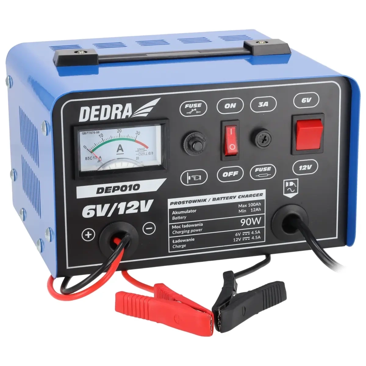Prostownik DEDRA DEP010 to urządzenie przeznaczone do ładowania akumulatorów kwasowo-ołowiowych o napięciu 6 i 12, o pojemnościach od 12 do 1200 Ah i swobodnym przepływie elektrolitów. Urządzenie przeznaczone do wykorzystywania w gospodarstwach domowych, warsztatach naprawczych, pracach amatorskich. Prostownik DEDRA DEP010 doskonale sprawdzi się podczas ładowania akumulatorów stosowanych w samochodach, motocyklach,