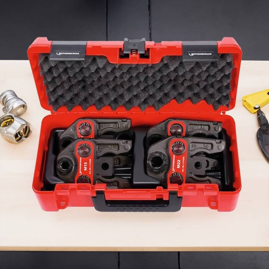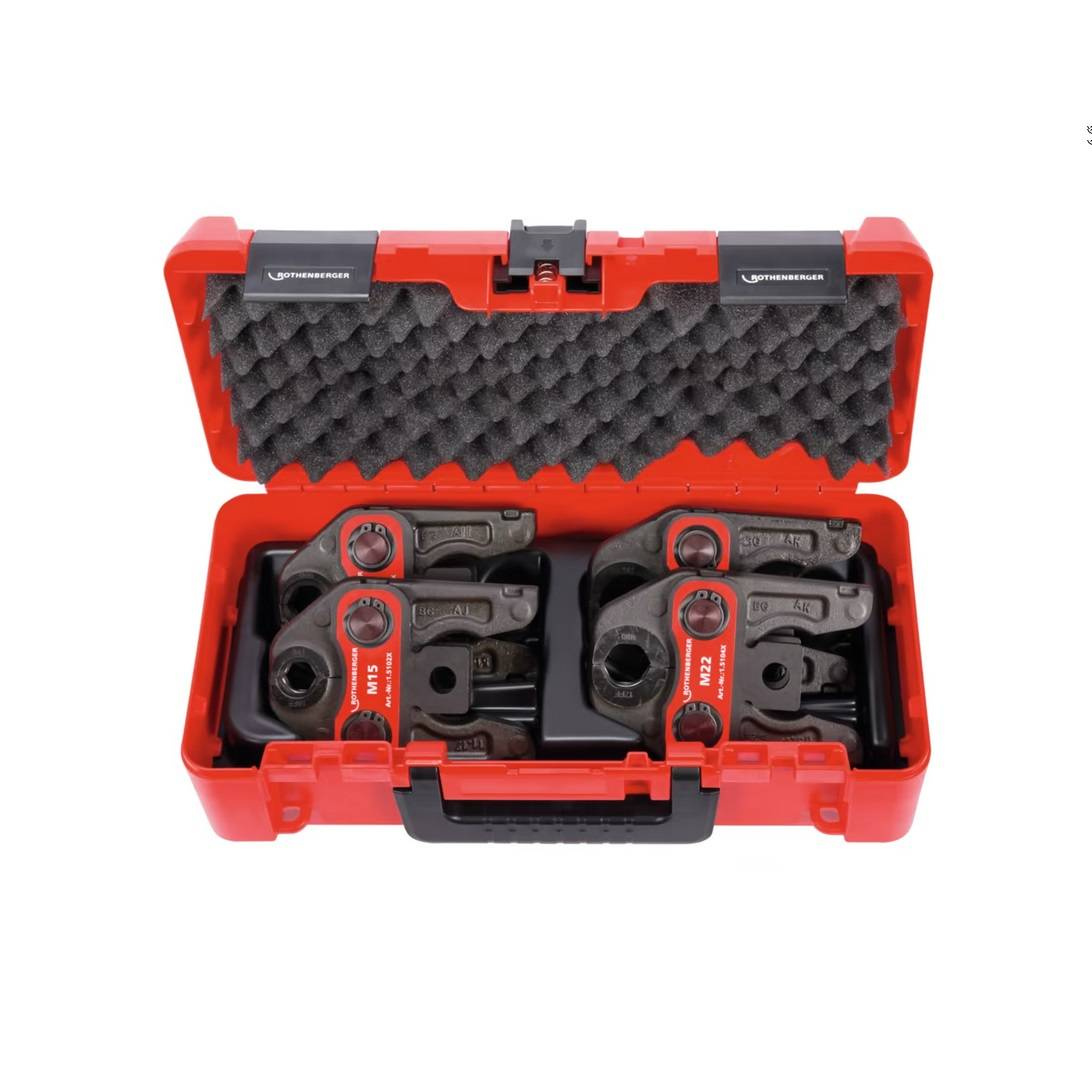 Zestaw szczęk zaciskowych Rothenberger Standard M 15/18/22/28 mm 15062X wykonany został z wysokiej jakości odpornej stali, umożliwiając pracę z maksymalnym naciskiem 34 kN. Szczęki doskonale sprawdzą się do systemowego zaprasowywania złączek wykonanych z metalu oraz tworzywa sztucznego. Proces zaprasowywania jest bezpieczny i precyzyjny - wszystko za sprawą częściowego hartowania laserowego oraz specjalnej technologii DURA LAZR TEC.