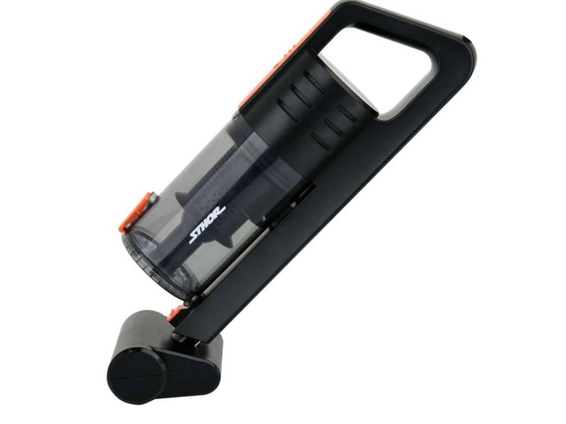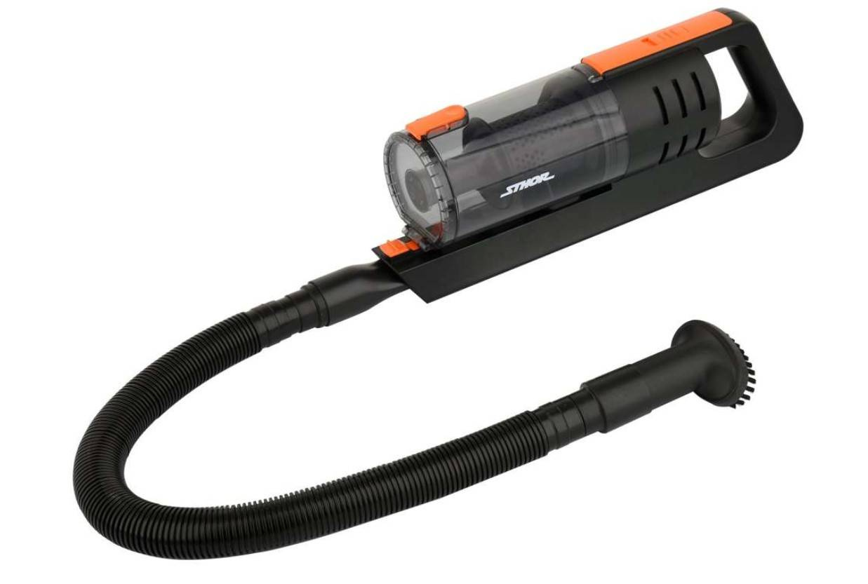 Odkurzacz samochodowy Sthor 82970  to elektronarzędzie o mocy 100W i bardzo dużym, rzadko spotykanym w modelach bezprzewodowych podciśnieniu 5,5kPa. Jedna z największych mocy ssania na rynku, zwłaszcza dla odkurzacza bezprzewodowego! Wielu producentów nie podaje tej wartości aby ją ukryć a jest najważniejszym parametrem pracy urządzenia. W połączeniu ze szczotką TURBO daje doskonałe efekty.  Dodatkowo technologia cyklonowa zwiększa moc ssania dzięki ruchu wirowemu zanieczyszczeń wokół filtra. Dołączone akcesoria ułatwią dokładne odkurzenie auta, także trudno dostępnych miejsc i zakamarków. Zestaw zawiera między innymi wyróżniającą odkurzacz na rynku automatyczną TURBO szczotkę. Obrotowa zmiotka w środku napędzana jest automatycznie przez osobny, wbudowany w odkurzaczu silnik. Dodatkowo na obudowie znajdują się 4 diody LED, które ułatwiają sprzątanie także po zmroku. Metalowy filtr HEPA  odkurzacza samochodowego Sthor gwarantuje skuteczną filtrację powietrza i redukcję zanieczyszczeń. Możliwość wielokrotnego użytku filtra, wystarczy wyjąć i przepłukać pod bieżącą wodą. Dodatkowo jest dużo trwalszy i bardziej odporny na działanie wody niż tradycyjne, materiałowe filtry HEPA. Praca na sucho i na mokro – możliwość sprzątnięcia niewielkiej ilości rozlanej cieczy. Metalowy filtr HEPA jest odporny na wodę a silnik odpowiednio zabezpieczony przed jej wtargnięciem. Nie należy jednak traktować urządzenia jako odkurzacz wodnego. Wydajny akumulator Li-Ion dzięki zastosowaniu aż 3 litowo-jonowych baterii o łącznej pojemności 2600mAh umożliwia ciągłą pracę aż do 15-18 minut. Nie tracimy więc ani mocy kosztem długości pracy, ani długości pracy kosztem mocy ssania Świetne sprawdzi się zarówno do odkurzania samochodów osobowych i ciężarowych jak i jako dodatkowy odkurzacz domowy.