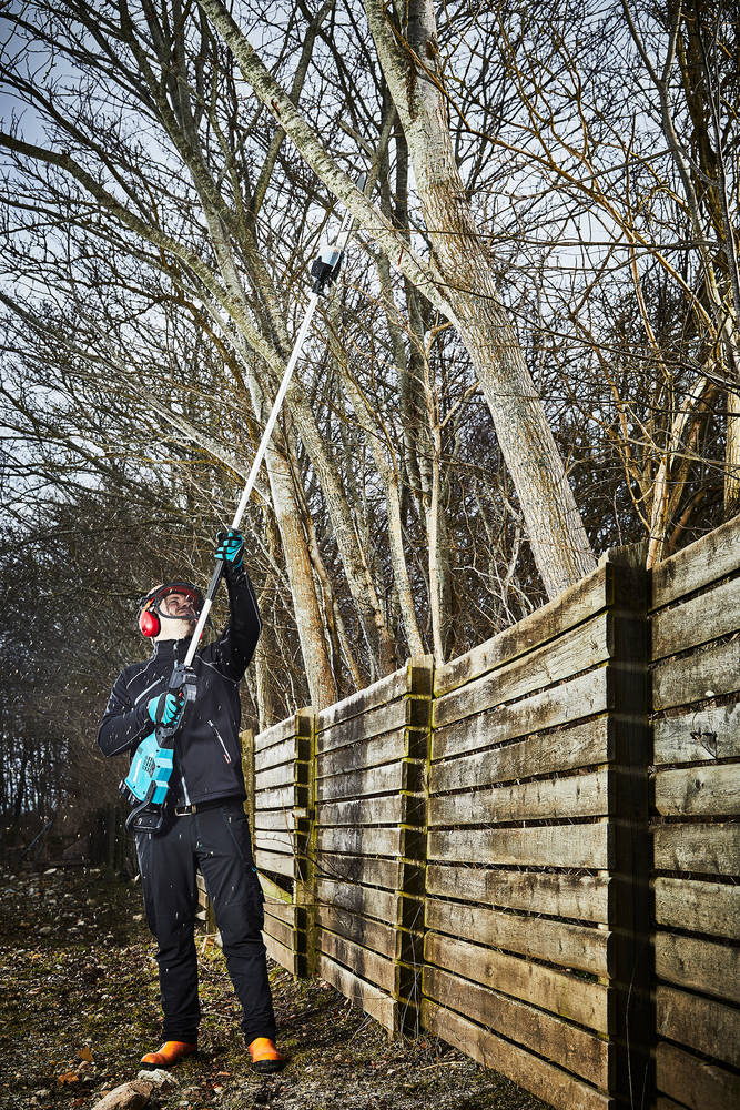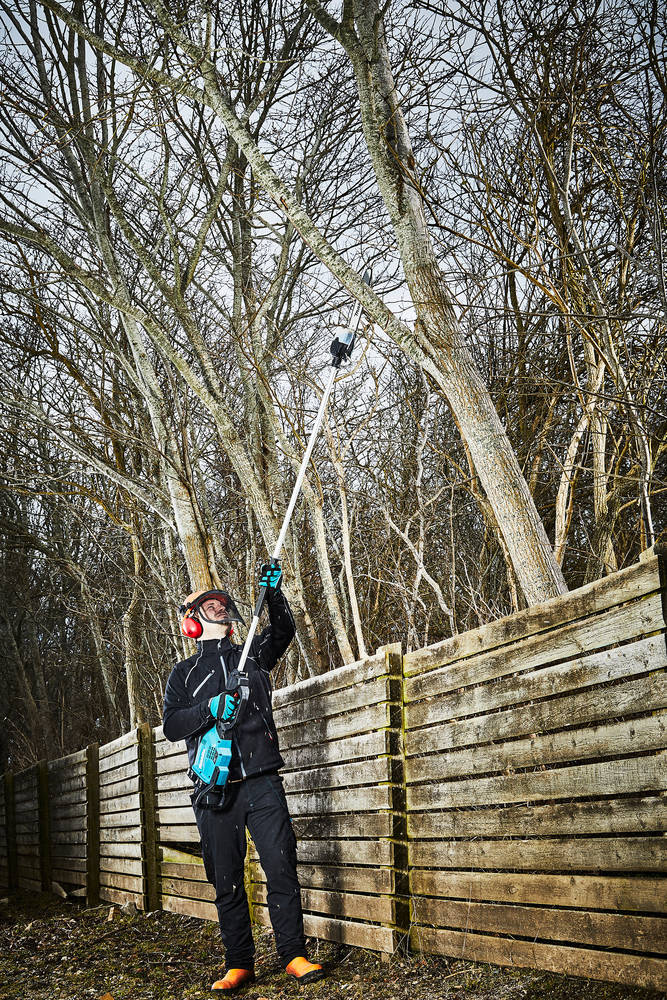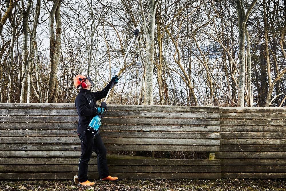 Podkrzesywarka Makita DUA300PT2 to zasilana akumulatorowo - okrzesywarka na wysięgniku, za której zasilanie odpowiadają 2 akumulatory 18 V z serii Makita LXT. Narzędzie posiada smukłą budowę głowicy tnącej, dzięki czemu zapewnia łatwe manewrowanie między gałęziami korony drzew. Pilarka na wysięgniku Makita DUA300PT2 gwarantuje dużą wydajność i sprawność cięcia, dostęp do trudno dostępnych miejsc i kompatybilność ze wszystkimi akumulatorami z narzędzi tej samej serii urządzeń akumulatorowych.