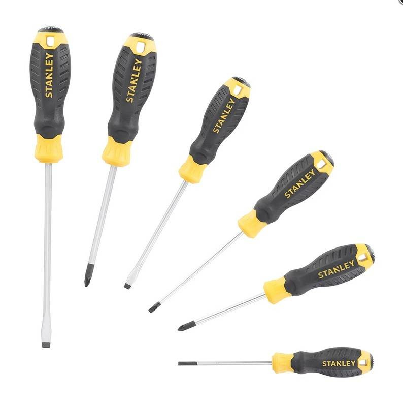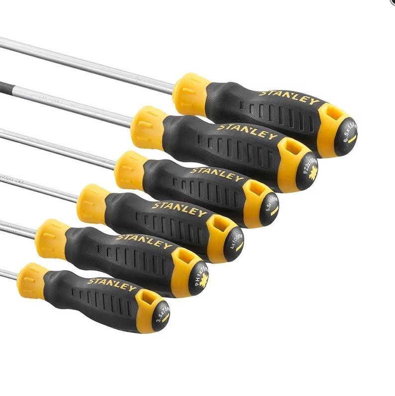 Zestaw wkrętaków Stanley STHT16172-0 składa się z sześciu śrubokrętów o końcówkach krzyżowych (PH, PZ) oraz prostych (SL). Ergonomiczna rękojeść o dużej średnicy oraz pręt wykonany ze stali chromowo-wanadowej, gwarantują wysoki moment obrotowy podczas wkręcania i wykręcania śrub i wkrętów. Końcówki rękojeści oznaczone wyraźnymi symbolami ułatwiają dobór odpowiedniego narzędzia do określonego zadania.