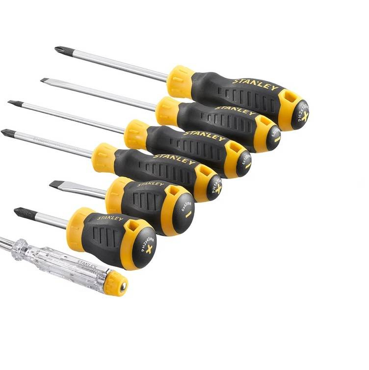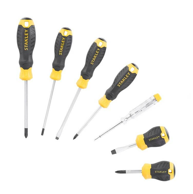 Zestaw wkrętaków Stanley STHT16166-0 składa się z sześciu śrubokrętów o końcówkach krzyżowych (PH) oraz prostych (SL) i próbnika. Ergonomiczna rękojeść o dużej średnicy oraz pręt wykonany ze stali chromowo-wanadowej, gwarantują wysoki moment obrotowy podczas wkręcania i wykręcania śrub i wkrętów. Końcówki rękojeści oznaczone wyraźnymi symbolami ułatwiają dobór odpowiedniego narzędzia do określonego zadania.