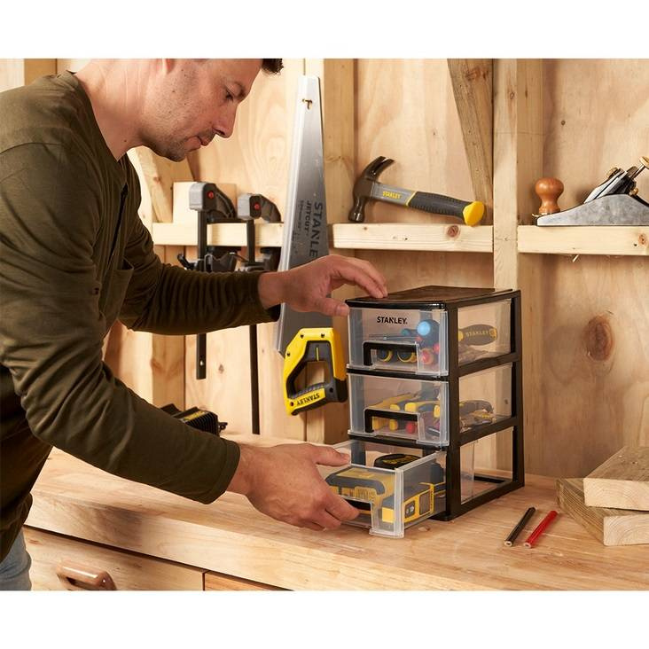 - Przechowuj swoje małe narzędzia i akcesoria w sposób uporządkowany dzięki 3 szufladowej szafce do przechowywania STANLEY® S