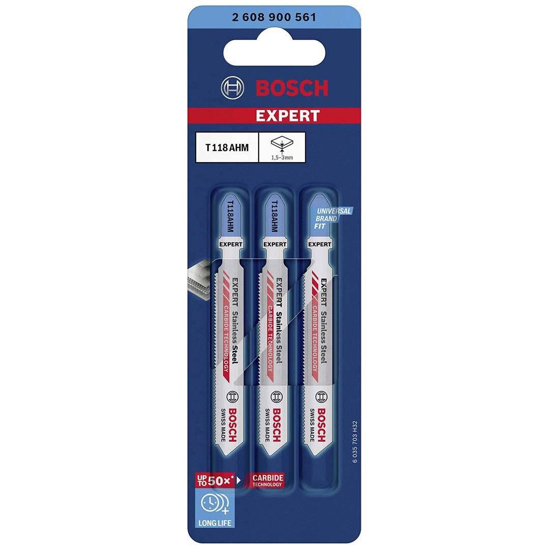 Bosch 2608900561 to zestaw 3 profesjonalnych brzeszczotów do wyrzynarek. Wykonane zostały w technologii Bosch Carbide, dzięki czemu cechuje je duża wytrzymałość. Brzeszczoty z węglika, zwiększają jego żywotność. Ostre zęby z węglików spiekanych gwarantują szybkie cięcie. Brzeszczoty pasują do wszystkich wyrzynarek z uchwytem typu T. Brzeszczoty Bosch EXPERT T 118 AHM idealnie sprawdzą się do cięcia cienkich arkuszy blachy nierdzewnej. Specjalny pasek z węglika umiejscowiony nad zębami brzeszczotu zwiększa jego sztywność, a tym samym przyczynia się do zwiększenia precyzji cięcia oraz sztywności brzeszczotu.