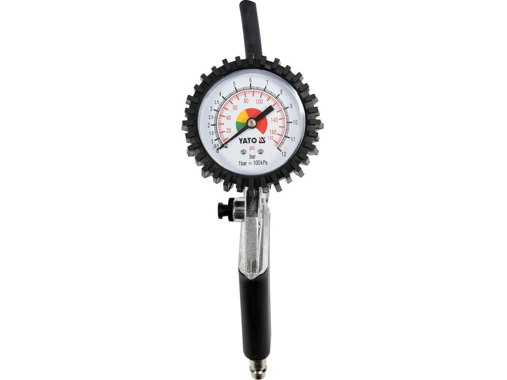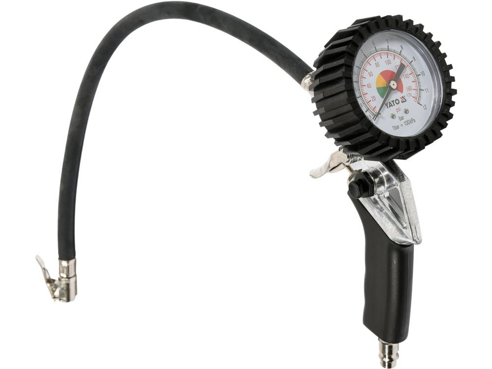 Pistolet do pompowania Yato YT-2370 wykonany został z aluminium oraz dodatkowo pokryty materiałem antypoślizgowym. Umożliwia pracę z maksymalnym ciśnieniem roboczym 0,8 MPa. Czytelny manometr o średnicy 75 milimetrów został dodatkowo zabezpieczony gumowym korpusem.