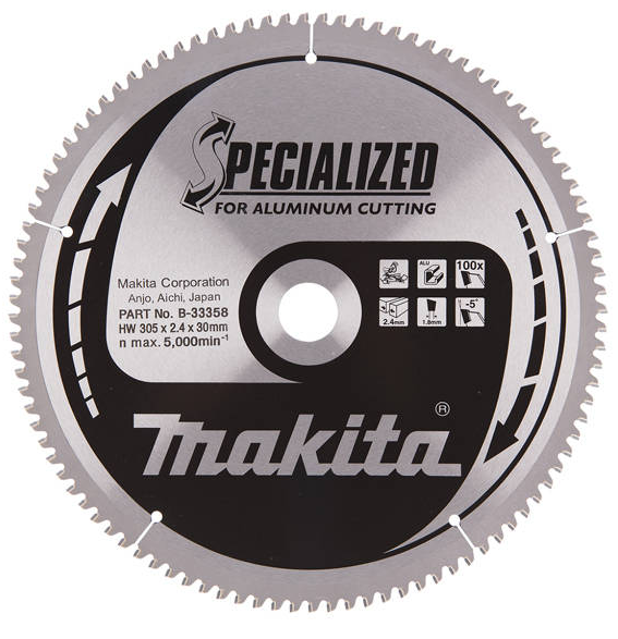 Tarcza tnąca Makita B-33358 to tarcza do cięcia aluminium przy pomocy ukośnicy. Tarcza tnąca do cięcia aluminium Makita B-33358 to wydajna tarcza do ukośnicy, o średnicy całkowitej 305 mm, z otworem montażowym 30 mm, o grubości 1,8 mm (grubość linii cięcia 2,3 mm) z 100 zębami.