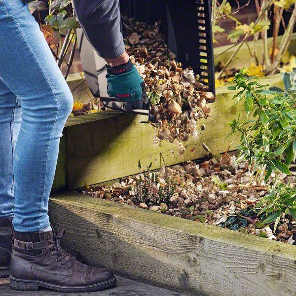 Zautomatyzowany lej załadowczy z łatwością mocuje się na górnej części rozdrabniacza. Przez szeroki otwór wsadowy wciąga materiał do układu tnącego, by bez problemu go rozdrobnić. Po zakończeniu pracy i zdjęciu leja rozdrabniacz do gałęzi Bosch AXT 22 D ma tylko 67 cm wysokości, co jest praktycznym rozwiązaniem, ułatwiającym przechowywanie. Bezpiecznie i wydajnie poradzi sobie nawet z większą ilością odpadów. Pojemny zbiornik mieści aż 53 litry materiału, co oznacza znacznie rzadsze opróżnianie i oszczędność czasu. Odpady ogrodowe wykorzystać możesz także jako pełną składników odżywczych ściółkę w Twoim ogrodzie.