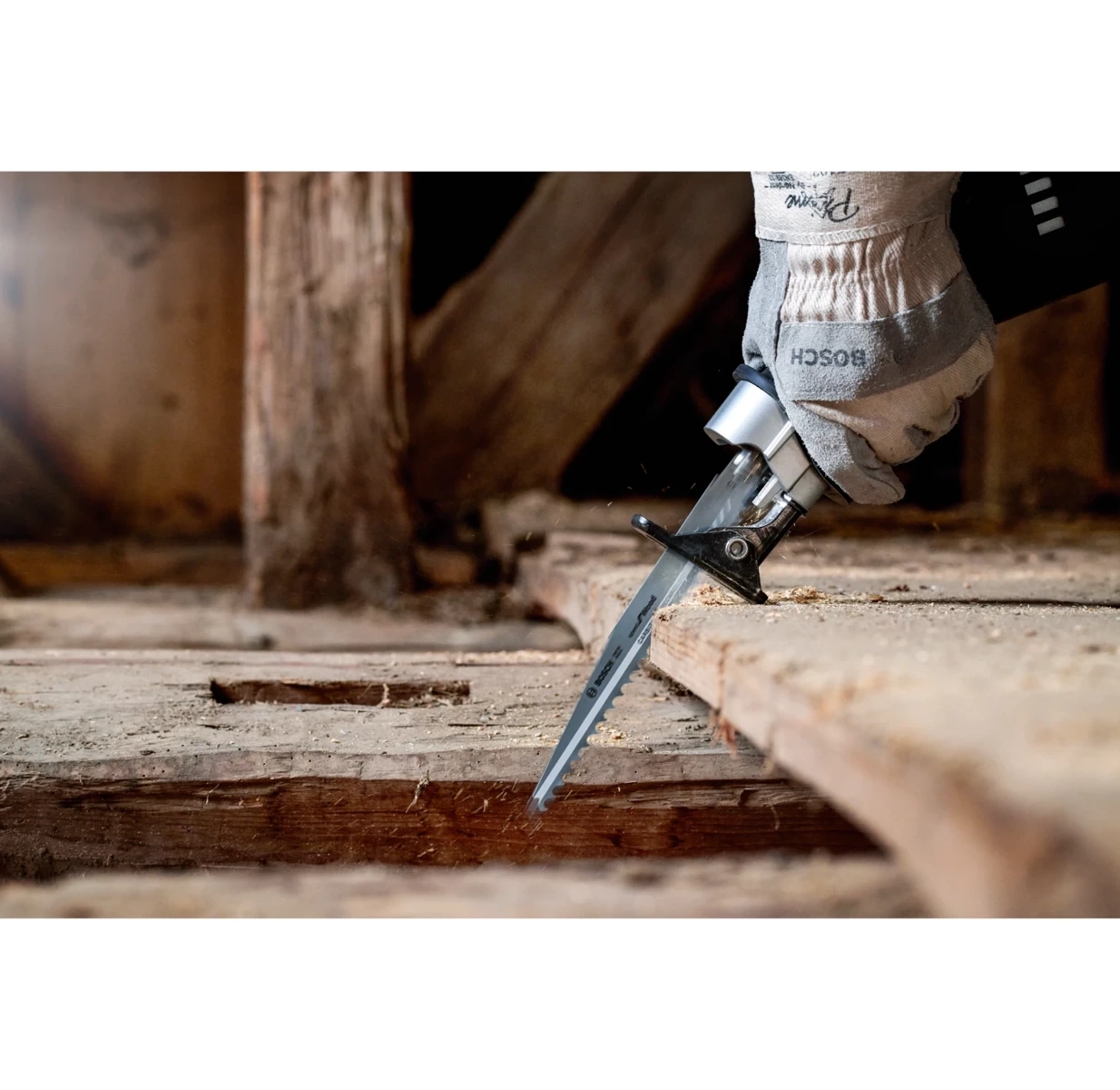 Brzeszczot do piły szablastej Bosch S1142KHM (2608900405) 10 szt. to zaawansowany osprzęt, który wyróżnia się wyjątkową wytrzymałością. Dzięki technologii Bosch Carbide Technology model ten wytrzymuje pracę w wymagających materiałach do 50 razy dłużej niż standardowe modele. Jest to idealne rozwiązanie do cięcia twardego drewna, w tym mokrej tarcicy, impregnowanych ciśnieniowo desek czy korzeni, co czyni go niezastąpionym w zadaniach ogrodniczych, stolarskich i budowlanych. Stożkowa końcówka brzeszczotu umożliwia precyzyjne cięcie w trudno dostępnych miejscach, a szeroki korpus i grube ostrze zapewniają stabilne prowadzenie. Dzięki dużym zębom brzeszczot skutecznie radzi sobie z szybkim i efektywnym cięciem nawet w najtwardszych materiałach.