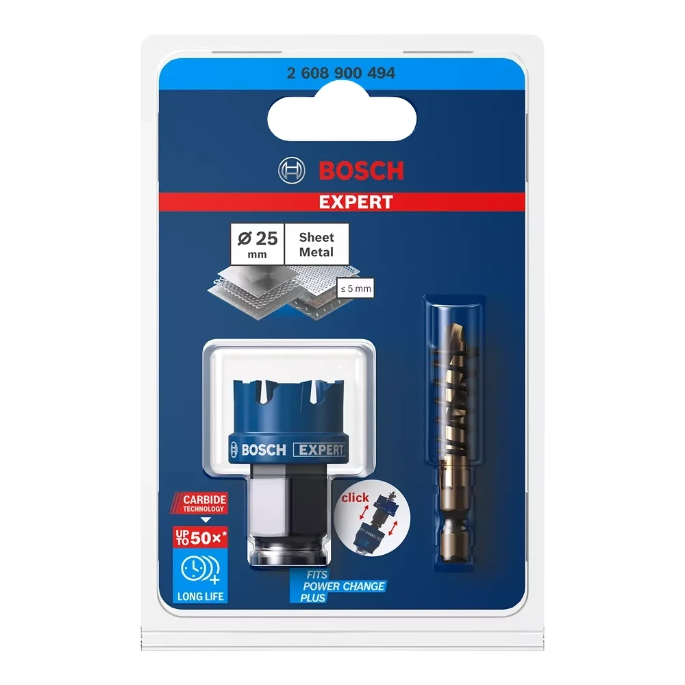 Otwornica do stali 25x5 mm Bosch Expert 2608900494 to zaawansowany osprzęt przeznaczony do precyzyjnego wycinania otworów w stali nierdzewnej oraz blachach stalowych. Dzięki zastosowaniu technologii Bosch Carbide Technology, otwornica wykazuje długą żywotność i wysoką wydajność podczas pracy w twardych materiałach. Produkt ten jest idealny do użytku w warunkach przemysłowych, ale sprawdzi się również w różnego rodzaju w warsztatach mechanicznych. Model Bosch Expert Sheet Metal cechuje się nawet 50 razy większą trwałością niż standardowe otwornice bimetalowe. Precyzyjnie oszlifowane, zaostrzone zęby z węglika gwarantują wyjątkową wytrzymałość, a konstrukcja wykonana z jednego kawałka metalu zapewnia maksymalną stabilność i precyzję działania. Otwornica jest kompatybilna z szybkozaciskowym uchwytem Bosch Power Change Plus, co ułatwia szybką wymianę osprzętu, zwiększając komfort i efektywność pracy.