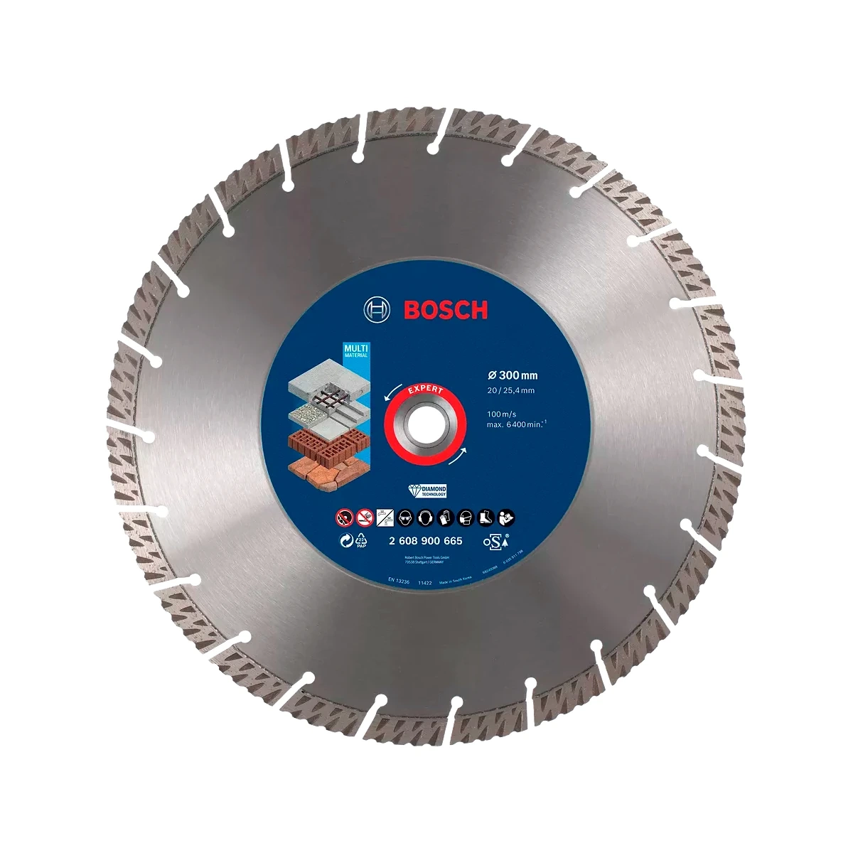 Diamentowa tarcza tnąca Bosch EXPERT MultiMaterial 300 x 25,40 x 3,3 x 15 mm 2608900665 to niezawodny osprzęt przeznaczony do użytku z przecinarkami do betonu, który świetnie sprawdzi się na placu budowy czy podczas gruntownego remontu. Tarcza należy do profesjonalnej serii Bosch EXPERT i została wykonana przy zastosowaniu zaawansowanej technologii Diamond Technology. Wytrzymały stalowy korpus pozwala na wykonywanie prac o dużej intensywności a spawane laserowo segmenty gwarantują sztywność i trwałość konstrukcji. Diamentowy nasyp o dużej twardości sprawia, że tarcza wolno się zużywa i pozwala na szybkie i bardzo efektywne cięcie.