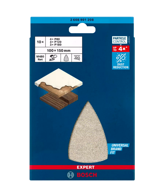 Zestaw siatek szlifierskich Bosch EXPERT M480 100 x 150 mm, 10 szt. 2608901208 to komplet 10 sztuk siatek ściernych o różnych gradacjach (P80, P120, P180). Siatki te wyróżniają się trwałością, precyzją oraz wydajnością dzięki zastosowaniu nowoczesnych technologii. Dzięki specjalnej konstrukcji siatki, możliwe jest efektywne odprowadzanie pyłu podczas pracy, co zwiększa komfort użytkowania i wydłuża żywotność samej siatki.  Siatki mocowane są na rzep, co zapewnia ich szybkie i pewne zamocowanie na szlifierkach oscylacyjnych ze stopą typu delta.
