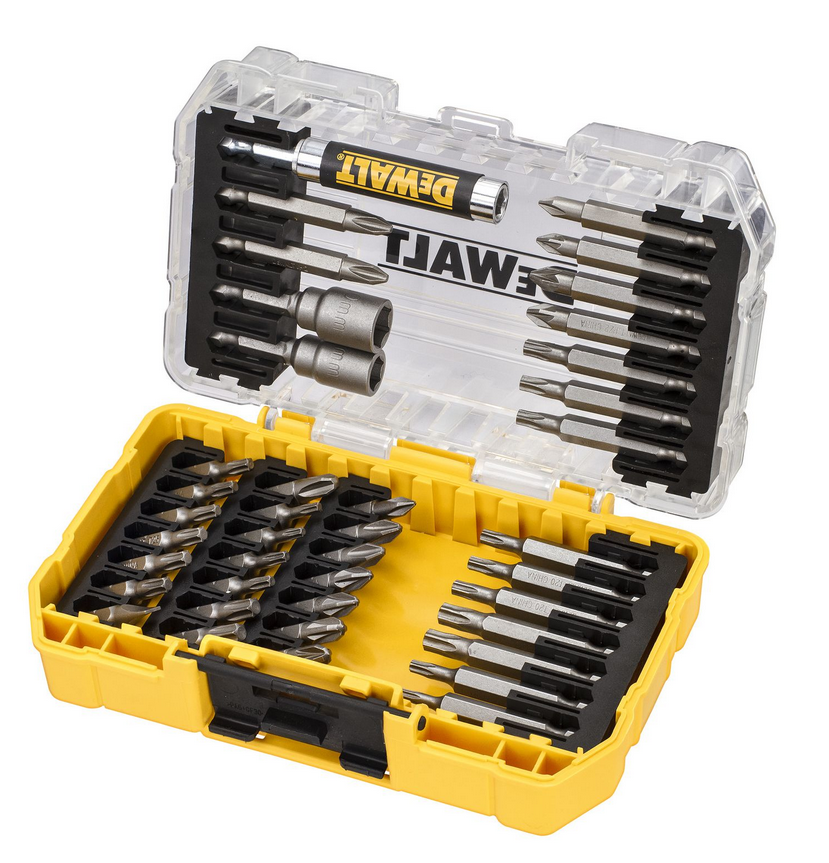 Zestaw końcówek Dewalt DT70705-QZ składa się z bitów philips, bitów pozidriv, bitów torx , nasadek oraz uchwytu magnetycznego w pojemniku z tworzywa sztucznego.