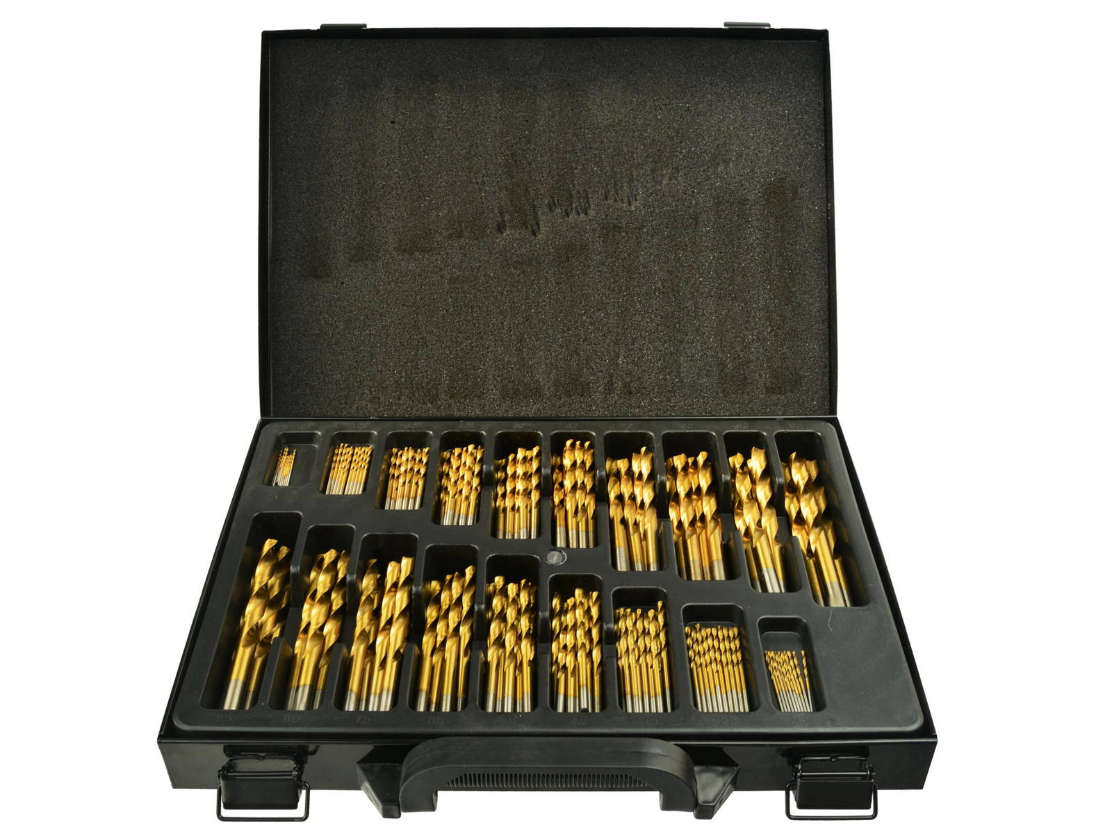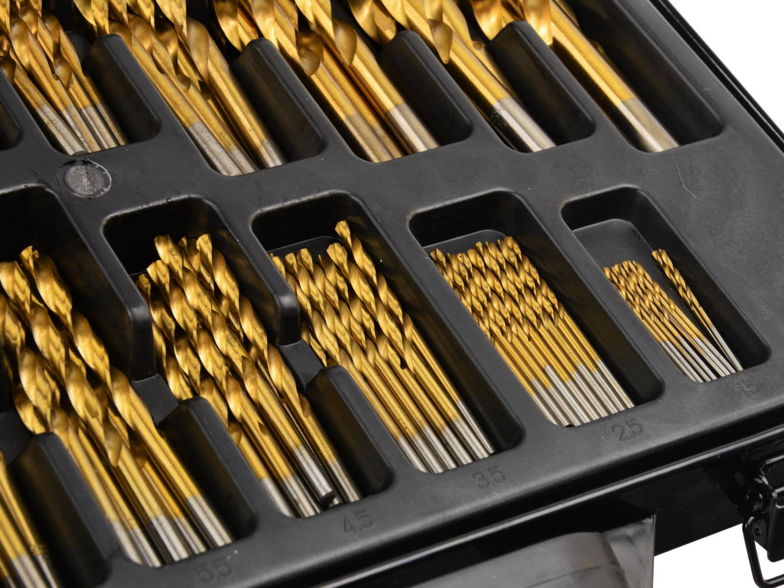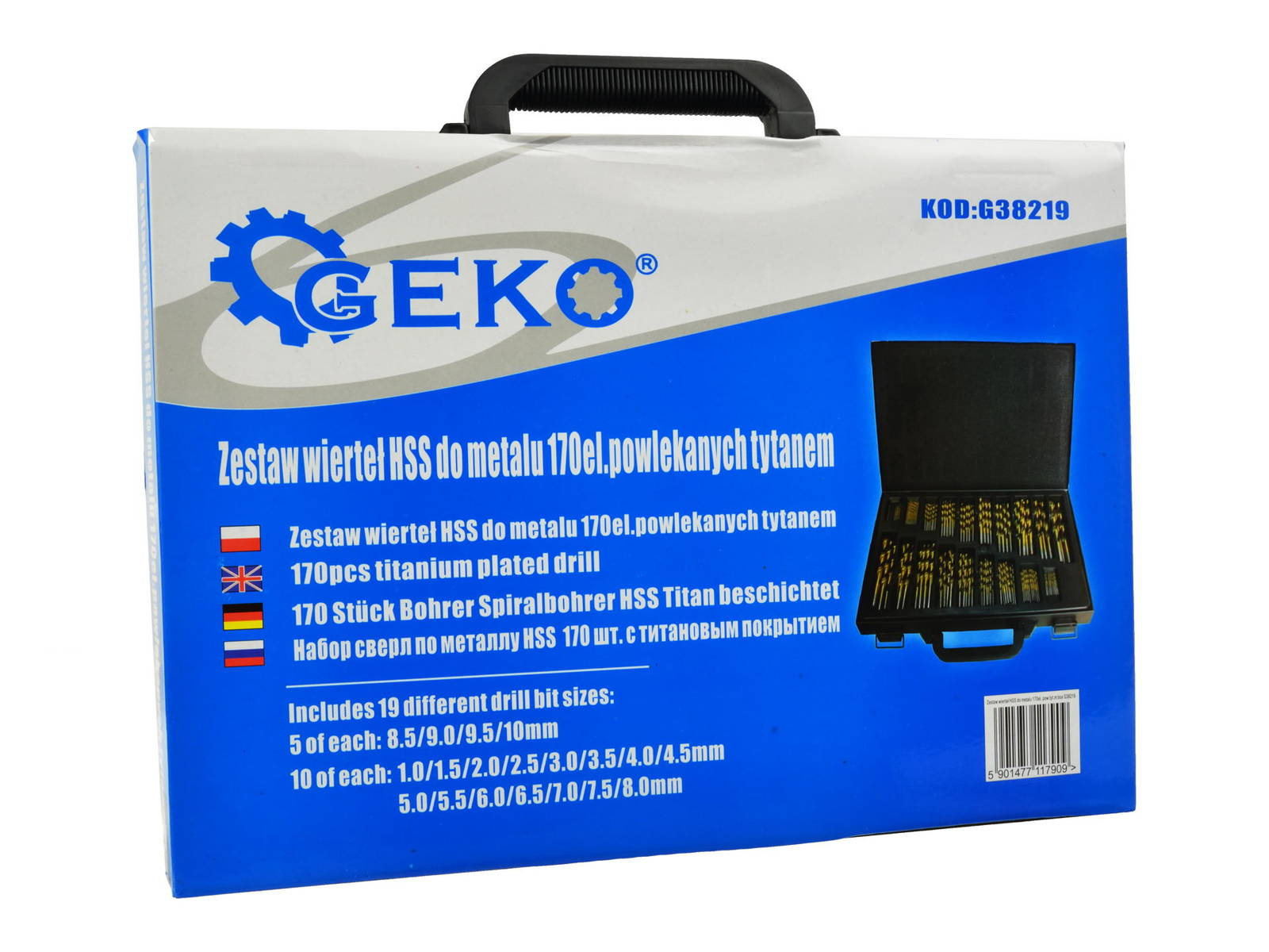 Zestaw wierteł HSS Geko G38219 składa się ze 170 sztuk wierteł powlekanych tytanem, zapakowanych w praktyczną walizkę.