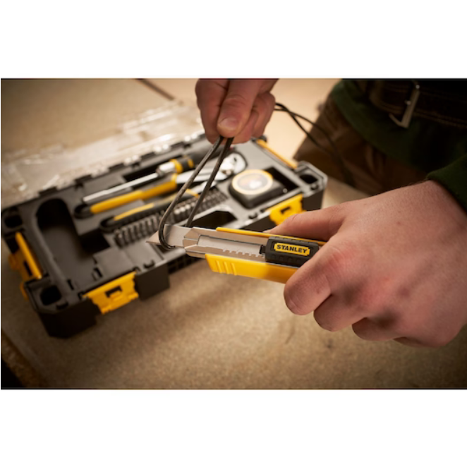 Zestaw narzędzi Stanley FMMT98106-1 w skład którego wchodzi wkrętak z grzechotką wraz z 40 bitami, 5 metrowa miara, szczypce nastawne i nóż łamany. Całość umieszczona w praktyczne opakowanie z przeźroczystym zamknięciem umożliwiające wygodny transport oraz szybką identyfikację narzędzi. Zestaw sprawdzi się podczas wielu prac naprawczych oraz podczas majsterkowania.