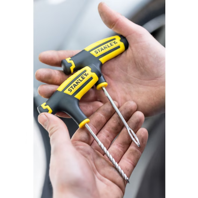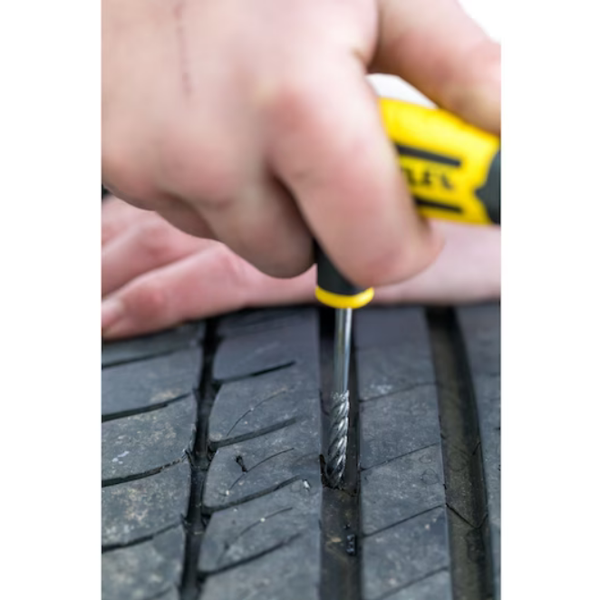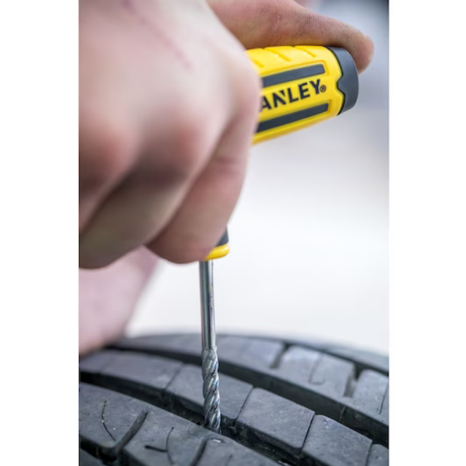 Zestaw naprawczy Stanley STHT80891-0 przeznaczony jest do naprawy uszkodzonych opon samochodowych, bez konieczności zdejmowania opony z felgi. W skład zestawu wchodzi wkrętak z gwintem oraz dłuto, umożliwiające przeciągnięcie paski uszczelniające przez dziurę w opinie.