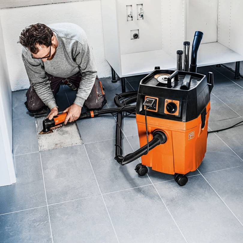 Odkurzacz przemysłowy Fein DUSTEX 35 L to wydajne urządzenie do sprawnego odkurzania zarówno na sucho, jak i mokro. Pozwala na podłączenie do elektronarzędzi w warunkach warsztatowych oraz w trakcie prac montażowych. Posiada certyfikat do pyłów klasy L