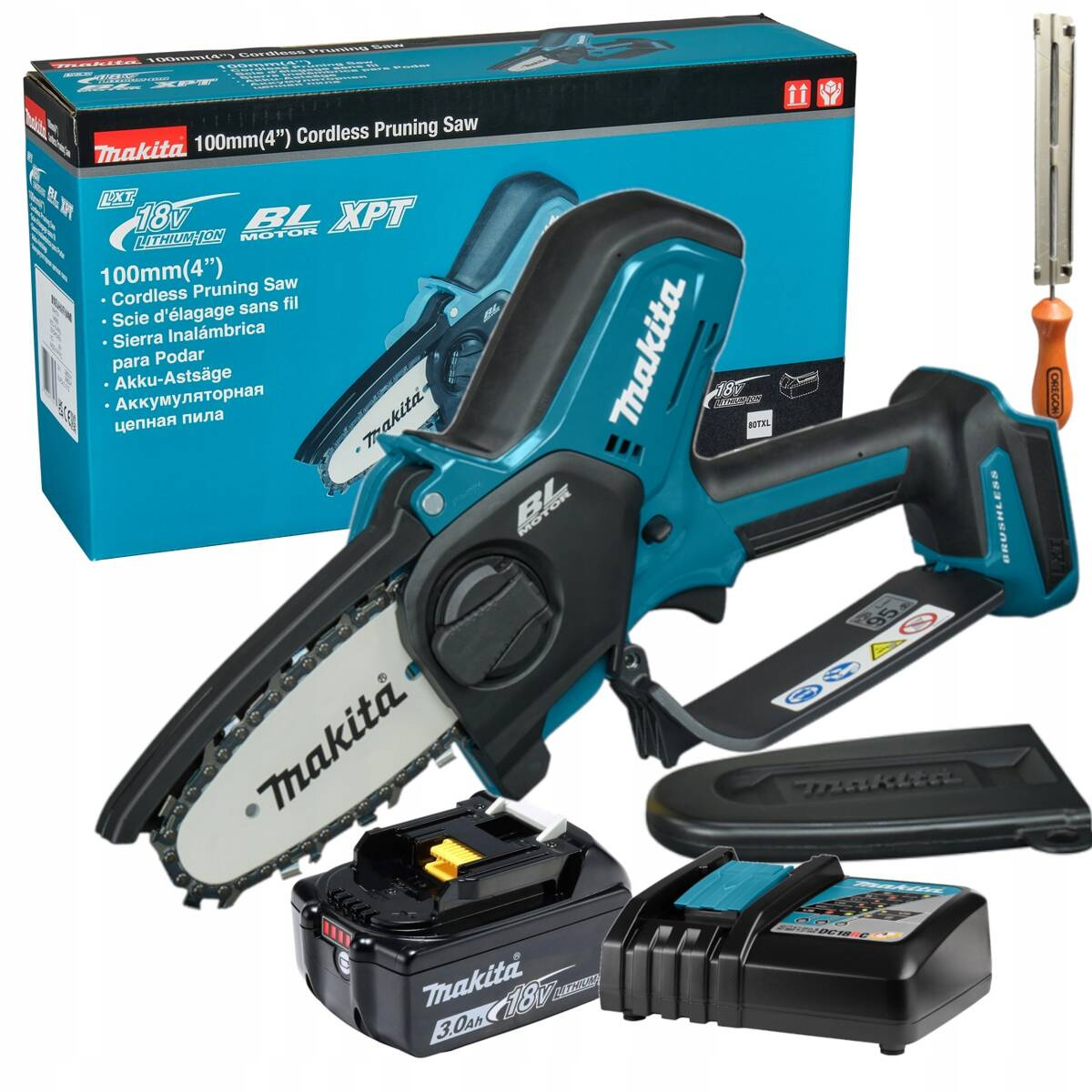 Mini piła łańcuchowa w wariancie wyposażenia Makita DUC101SF01 - zawiera zestaw zasilający, składający się z akumulatora i ładowarki.