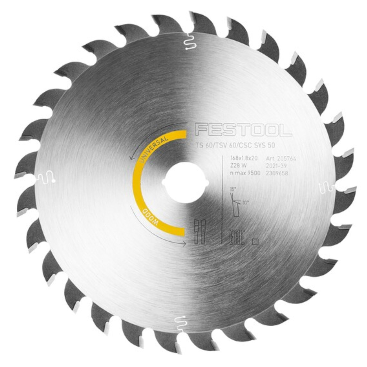 Tarcza do cięcia drewna Festool Wood Universal 168 x 20 x 1,8 28Z 205764 wykonana została z wysokiej jakości stali, z zębami z drobnoziarnistego węglika spiekanego i zębami przemiennymi w kształcie litery W. Przeznaczona do pracy z z materiałami drewnianymi i drewnopochodnymi, jak sklejki i drewno wielowarstwowe, surowe płyty wiórowe, płyty pilśniowe MDF i HDF. Perfekcyjne współdziałanie tarczy z zagłębiarką TS 60 K.