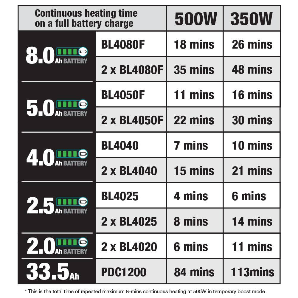 Mikrofalowka Makita MW001GZ to bezprzewodowa kuchenka mikrofalowa zasilana akumulatorami z serii XGT 40 V Max o pojemności 8 litrów. Urządzenie podgrzewa umieszczone w środku jedzenie oraz napoje z mocą 350 W. Dodatkowa funkcja boost umożliwia czasowe zwiększenie mocy ogrzewania do 500W (moc urządzenia wraca automatycznie to 350W po 8 minutach). Mikrofalówka ma możliwość ustawienia czasu ogrzewania w 10 sekundowych odstępach, a jej maksymalny czas ogrzewania wynosi 20 minut. Zasilana za pomocą dwóch akumulatorów (brak w zestawie) o pojemności 8,0 Ah, przy mocy 350 W może pracować przez przerwy do 48 minut.