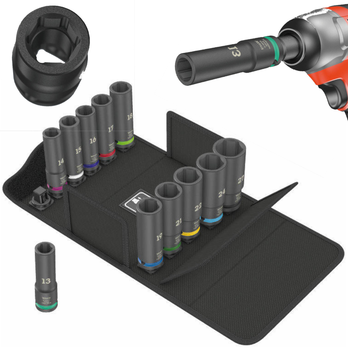 Zestaw nasadek udarowych Wera 8790 C impaktor Deep Set 1 05004841001 to zestaw 11 nasadek przeznaczonych do pracy z pneumatycznymi i elektrycznymi kluczami udarowymi z mocowaniem 1/2". Dzięki 83 milimetrowej długości każdej z końcówek sprawdzą się podczas pracy z głęboko osadzonymi połączeniami śrubowymi. Technologia Impaktor umożliwia uzyskanie ponadprzeciętnej żywotności narzędzi nawet w wymagających warunkach pracy. Profil sześciokątny HEX umożliwia przenoszenie dużych sił z zachowywaniem precyzji i zabezpieczeniem profilu. System oznaczenia kolorystycznego kluczy według rozmiaru "Take it easy" ułatwiający i przyspieszający odnajdywanie właściwego narzędzia.
