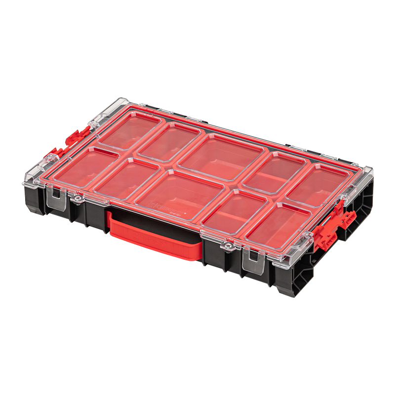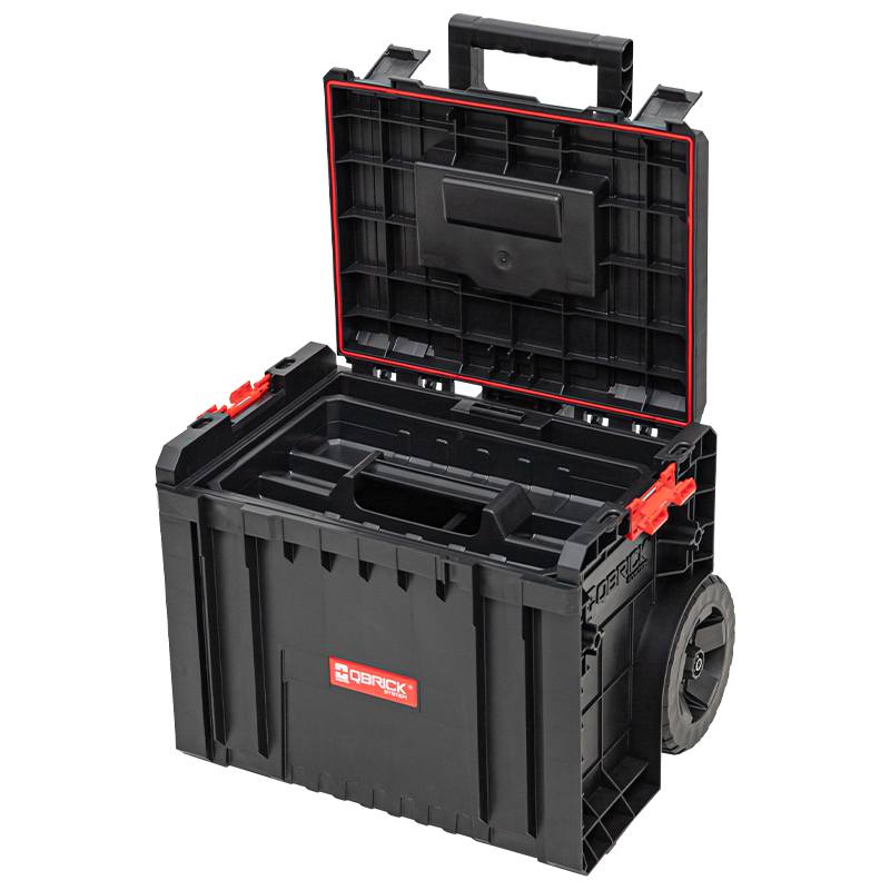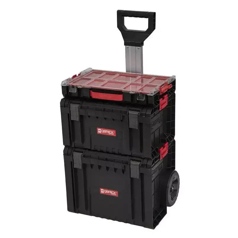 Zestaw skrzyń narzędziowych QBRICK SYSTEM PRO Set 2 dzięki zastosowaniu dużych kół w dolnej skrzyni charakteryzuje się wysoką mobilnością i umożliwia wygodny transport narzędzi i osprzętu. Dzięki zastosowaniu elastycznej uszczelki w każdej ze skrzyń, wnętrze skrzyń jest zabezpieczone od dostawania się wody i kurzu do ich wnętrza. Dodatkowo skrzynie łączone są ze sobą za pomocą wytrzymałych, poliamidowych konektorów. Pozwala to bezpiecznie przechowywać i transportować elektronarzędzia i narzędzia ręczne. Zestaw QBRICK SYSTEM PRO Set 2 charakteryzuje się dołączonym do zestawu organizerem z ośmioma pojemniczkami umieszczonymi w środku, z dodatkowymi przegródkami.