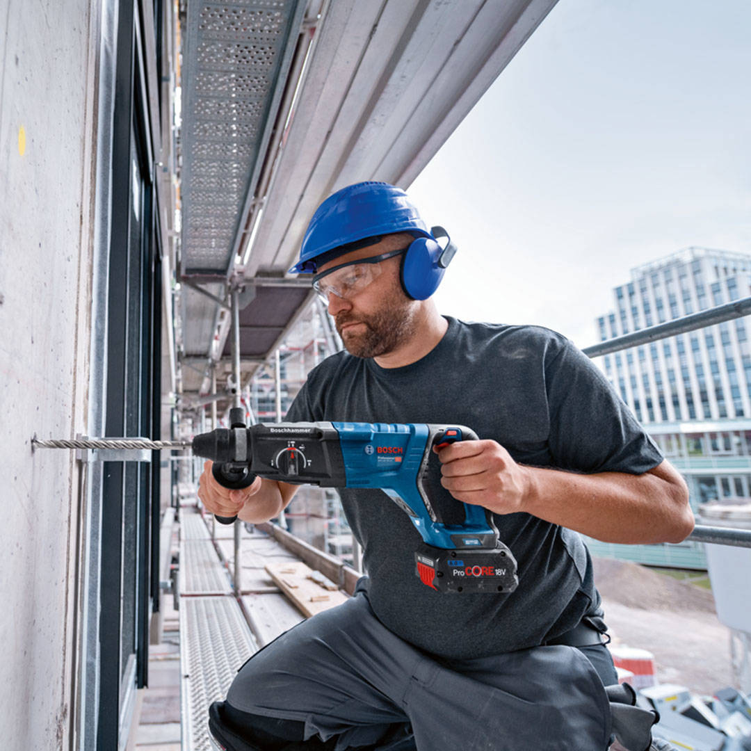 Bosch GBH 18V-28 DC to akumulatorowa młotowiertarka przeznaczona do ciężkich prac związanych z kuciem oraz wierceniem otworów w materiałach kamiennych takich jak beton, beton zbrojony, beton komórkowy, cegła i innych. GBH 18V-28 DC posiada uchwyt typu D, który wykonany jest ze współudziałem technologii VIBRATION CONTROL.Uchwyt ten redukuje przenoszone wibracje, powstałe w skutek pracy urządzenia na ręce operatora. Obudowa została zaprojektowana tak, aby praca elektronarzędziem była komfortowa i ergonomiczna. Ponadto młotowiertarka charakteryzuje się uchwytem narzędziowym SDS-PLUS, dzięki czemu do wymiany osprzętu nie są wymagane żadne, dodatkowe narzędzia. Młotowiertarka Bosch GBH 18V-28 DC dostarczana jest w walizce, dzięki której możliwe jest bezpieczny transport i przechowywanie elektronarzędzia.