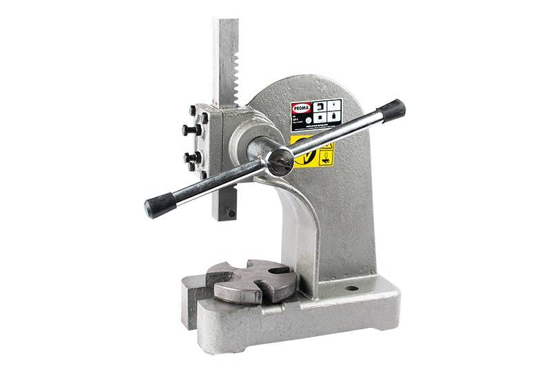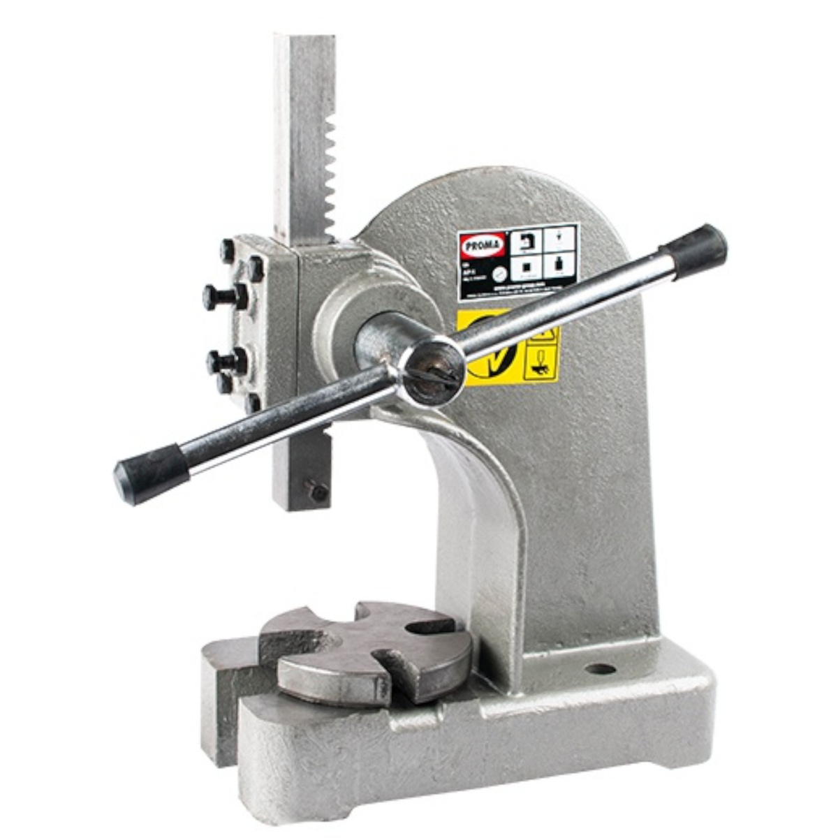 Prasa ręczna Proma AP-1 (numer katalogowy: Proma 25000001) to specjalistyczne narzędzie stworzone z myślą o prasowaniu łożysk, piast, tulei oraz różnych części maszyn. To urządzenie charakteryzuje się zdolnością generowania siły nacisku sięgającej nawet 1 tony. Składająca się z żeliwnego korpusu, stołu oraz dwóch zębatych komponentów, zapewnia dużą siłę nacisku prasy. Dodatkowo, prasa posiada ruchomy stół roboczy z rowkami, o czterech różnych rozmiarach, co umożliwia pewne mocowanie obrabianego materiału.