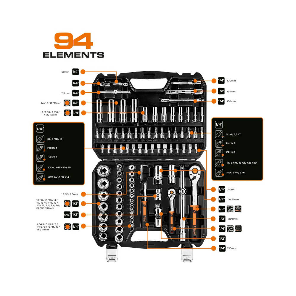 Klucze nasadowe NEO Tools 1/4", 1/2" zestaw 94szt. 10-062 to składający się z 94 wysokiej jakości produktów zestaw umieszczony w solidnej walizce z tworzywa. Wertykalne rozmieszczenie produktów pozwala na łatwiejszą ich identyfikacje i lepsze utrzymanie porządku. Zestaw obejmuje szereg nasadek w rozmaitych rozmiarach, 2 grzechotki 1/2'' i 1/4'' z 90 zębami, bity, klucze sześciokątne oraz wiele akcesoriów - przedłużki, przeguby, adaptery i inne. Wszystkie części wykonano z użyciem stali chromowo-wanadowej, co zapewnia świetne właściwości wytrzymałościowe.