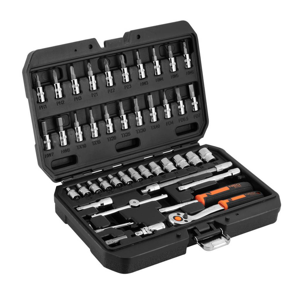 Klucze nasadowe NEO Tools 1/4'' zestaw 46szt. 10-004 to składający się z 46 produktów komplet, zamknięty w praktycznej i solidnej walizce z tworzywa. Obejmuje on grzechotkę 1/4'' z 90 zębami, wkrętak, 4 klucze sześciokątne, 13 nasadek sześciokątnych, 21 bitów na nasadkach oraz akcesoria takiej jak przedłużki, przegub czy pokrętło. Każdy z elementów wykonano z wykorzystaniem stali chromowo-wanadowej, gwarantującej wysoką wytrzymałość i dłuższą żywotność zestawu.