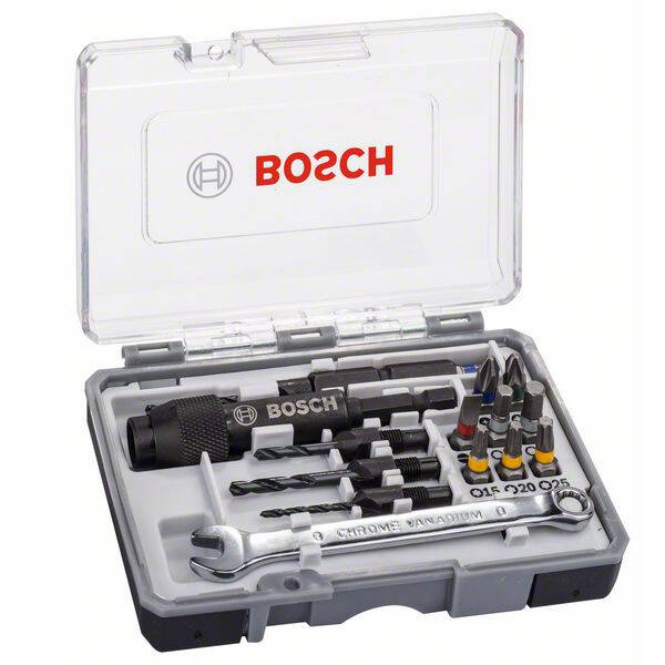 Końcówki wkręcające Bosch Drill&Drive zestaw 20szt. 2607002786 to komplet bitów do wkrętarek i wierteł krętych HSS Extra Hard, pozwalających na skuteczne i efektywne wiercenie i wkręcanie w rozmaitych materiałach - od cegły, przez płyty gk, aż po stal czy tworzywa sztuczne. Wykorzystanie wysokiej jakości stali gwarantuje wytrzymałość i długą żywotność wszystkich elementów zestawu.