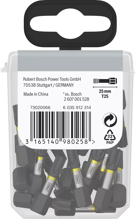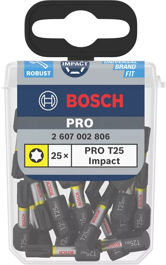 Zestaw 25 szt. bitów TX25 Bosch PRO Torx Impact, 25 szt. (2607002806) to zawierający 25 wysokiej jakości końcówek T25 komplet, który umożliwia skuteczną i efektywną pracę z wykorzystaniem wkrętarek udarowych.