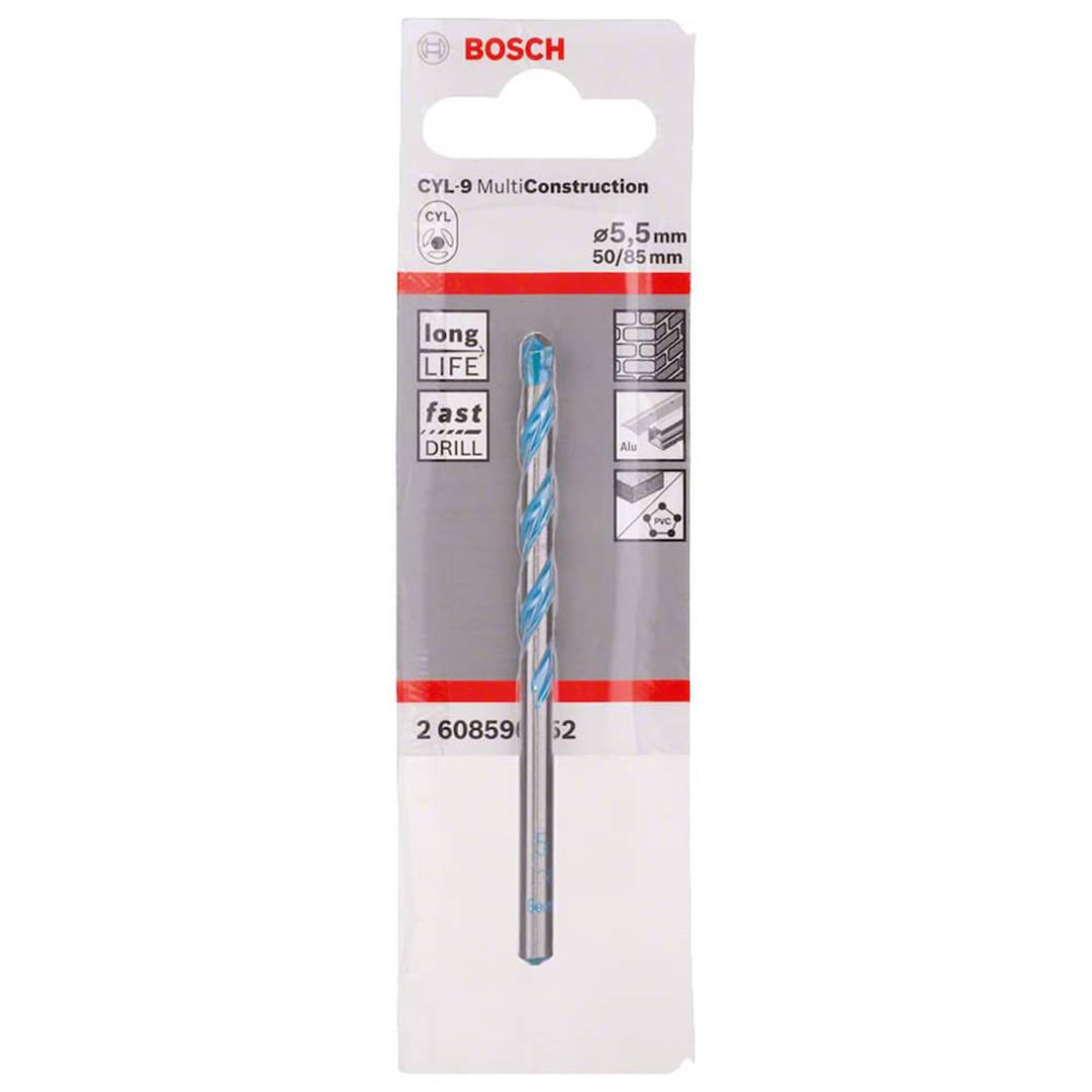 - Bosch 2608596052 to wiertło wielozadaniowe CYL-9 Multi Construction. Niebieskie z metalicznym szlifem. Średnica wiertła: 5,5 mm. Długość całkowita 85 mm. Długość robocza 50 mm. Uchwyt:walcowy.Do wszystkich materiałów stosowanych przy wykańczaniu wnętrz.