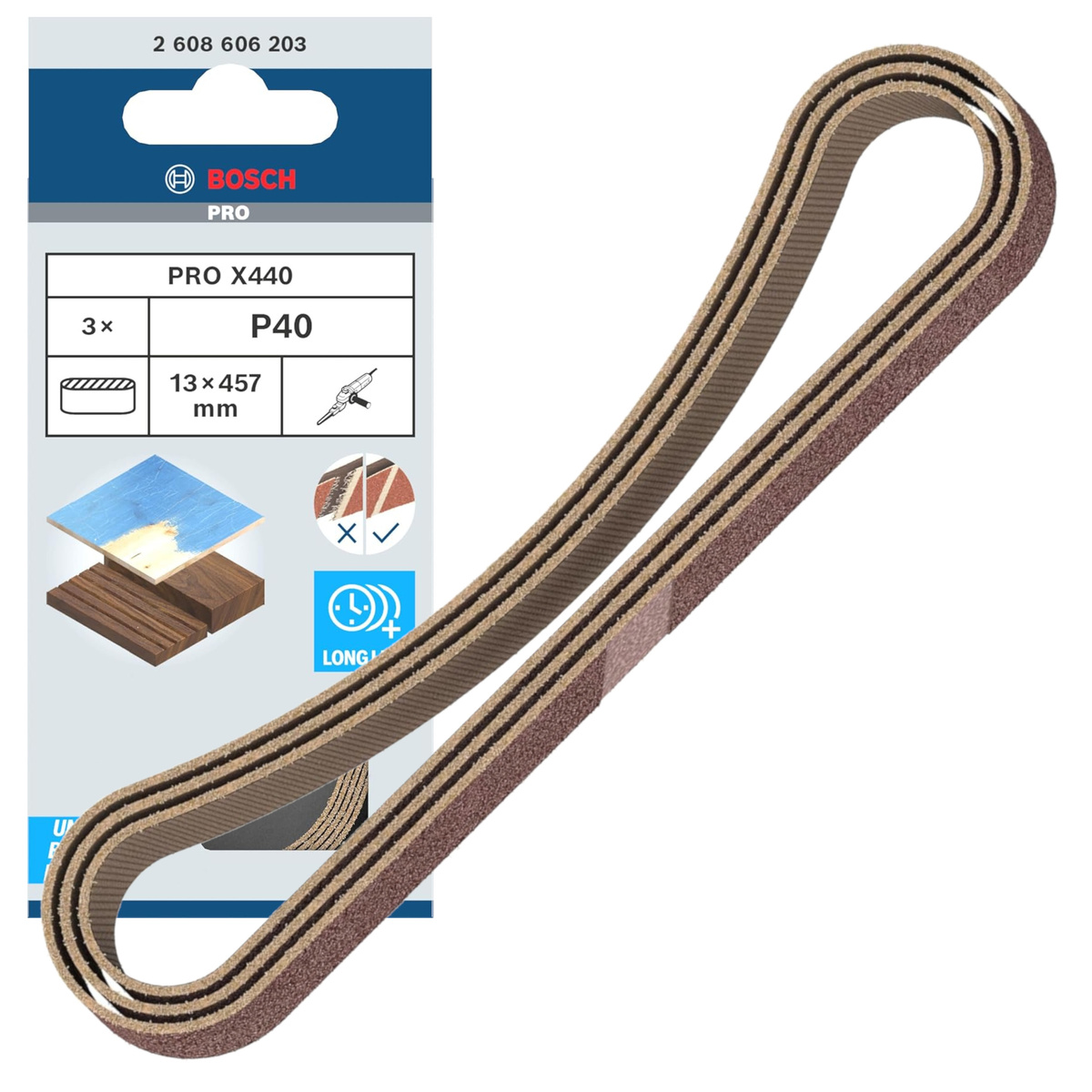 Pas bezkońcowy Bosch X440 13x457x40 2608606203 to wysokiej jakości akcesorium przeznaczone do pilników taśmowych, idealne do precyzyjnego i długotrwałego szlifowania drewna oraz farb. Wykonany z wytrzymałego płótna typu X, pas zapewnia doskonałą odporność na rozdarcia, co czyni go niezawodnym narzędziem nawet podczas intensywnej pracy na wymagających powierzchniach. Dzięki specjalnie wzmocnionemu złączu paskowemu pas jest wyjątkowo trwały i odpowiedni do najcięższych zadań. Doskonale sprawdzi się zarówno przy obróbce twardego drewna, jak i usuwaniu warstw farby, oferując równomierne rezultaty i długą żywotność.