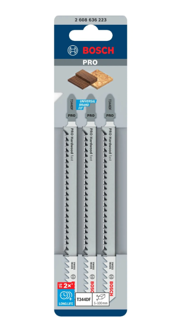 Brzeszczot do wyrzynarek T 344 DF Bosch 2608636223 3 szt. wyposażony jest w ostro oszlifowane zęby z podziałką 4 mm, dzięki czemu doskonale sprawdzi się podczas cięcia prostego w twardym drewnie. Długość brzeszczotu 152 milimetrów pozwala na cięcie elementów o grubości od 5 - 100 milimetrów.