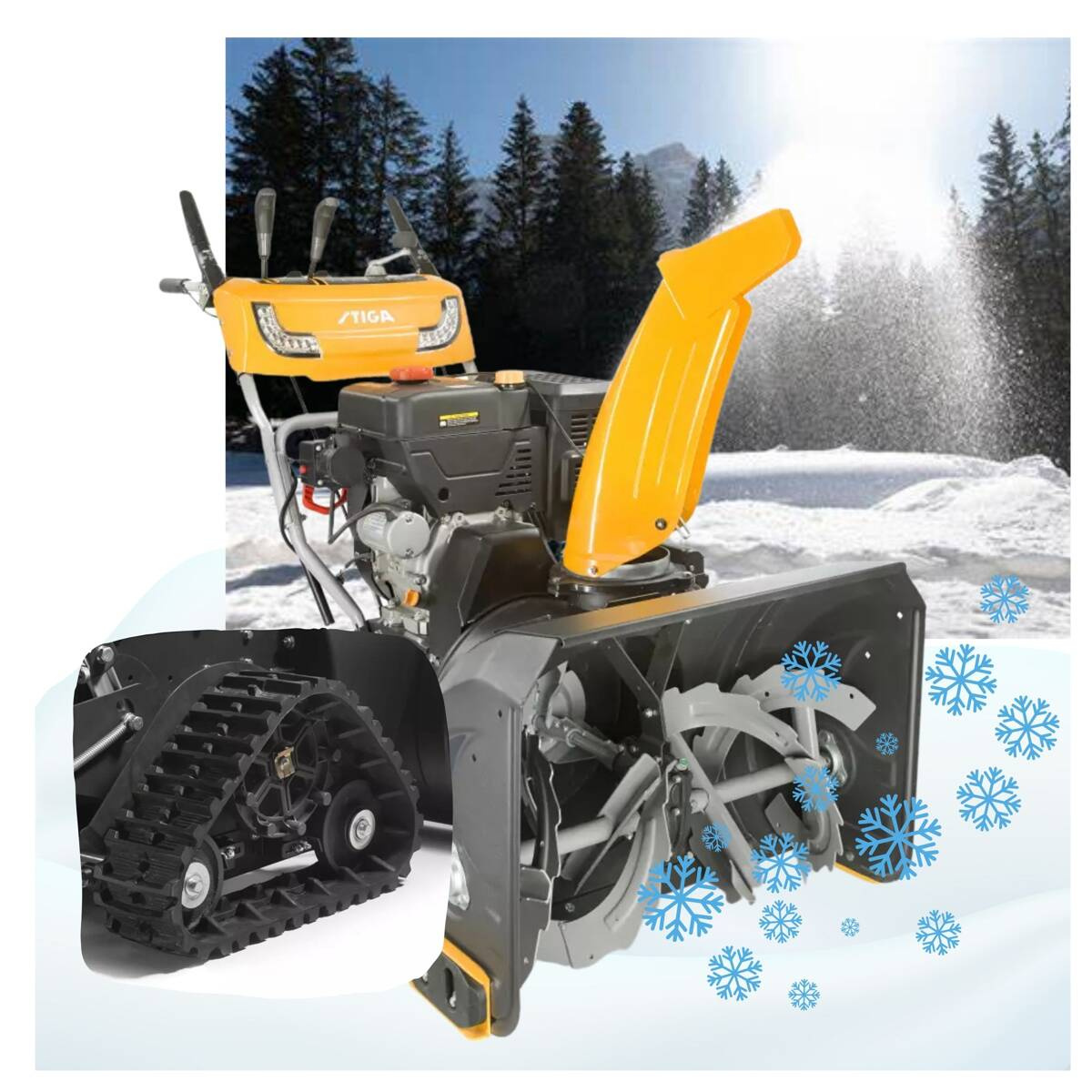 Odśnieżarka Stiga ST 5266 P TRAC to odśnieżarka gąsienicowa, dwustopniowa z silnikiem benzynowym, zapewniająca szerokością odśnieżania 66 cm. Maszyna napędzana jest silnikiem, o pojemności 302 cm3, umożliwia dwustopniowy system odśnieżania i napęd tarczowy cierny - 8 biegów (6 do przodu/2 do tyłu).