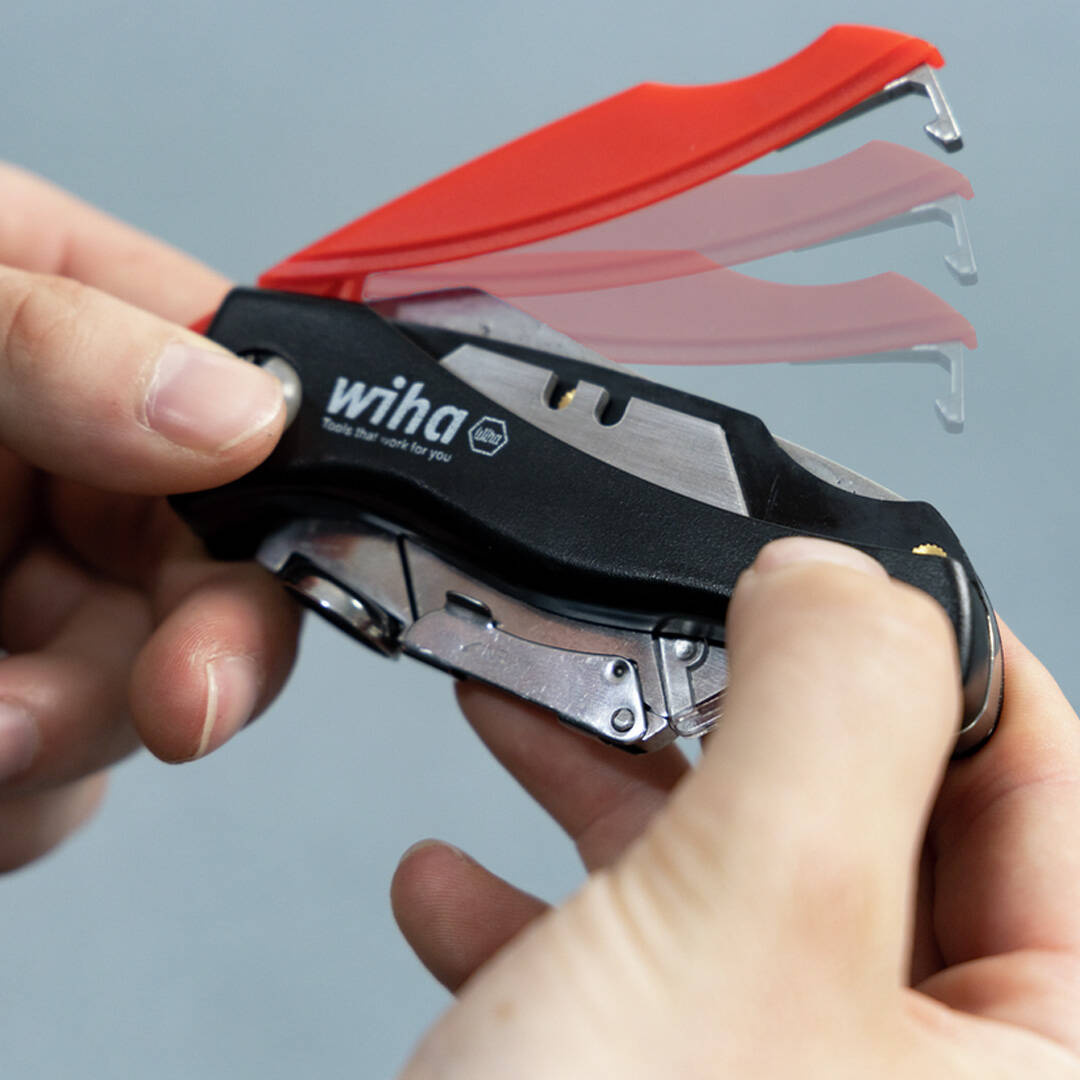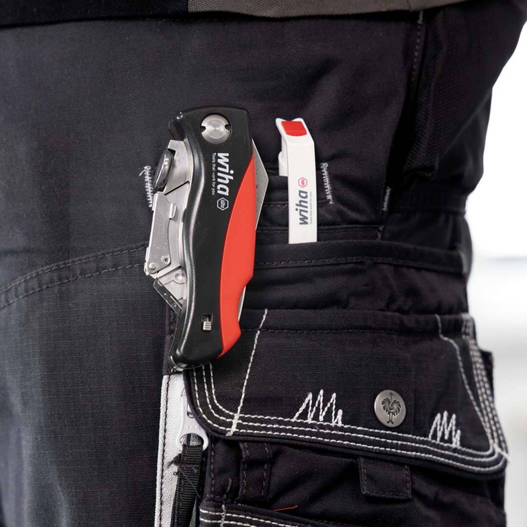 Nóż składany trapezowy Wiha 45425 to kompaktowy nóż tnący, który zmieści się w każdej kieszeni spodni, a nawet koszuli. Rękojeść noża pełni formę schowka na zapasowe ostrza tnące. Praktyczny mechanizm składania zapewnia bezpieczną obsługę i zmniejsza ryzyko obrażeń podczas transportu. Dodatkowym plusem jest podkładka pod kciuk, która zapewnia wygodę i pozwala zwiększyć nacisk podczas pracy.