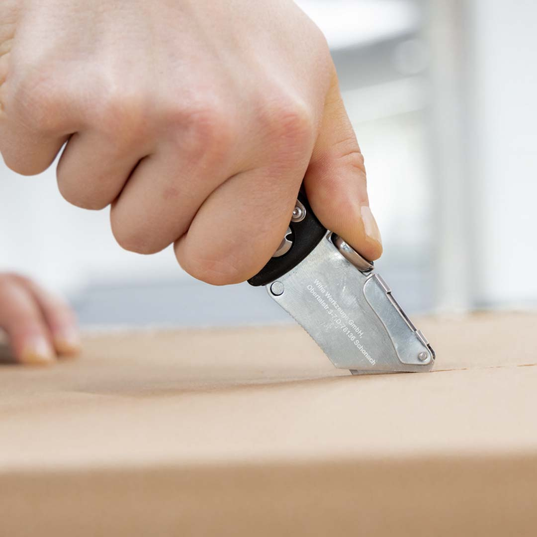 - W rękojeści noża znajduje się schowek na zapasowe ostrza z łącznie pięcioma ostrzami trapezowymi. Wymiana ostrzy nie wymaga użycia dodatkowych narzędzi