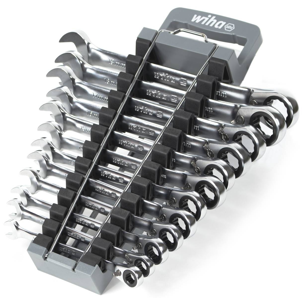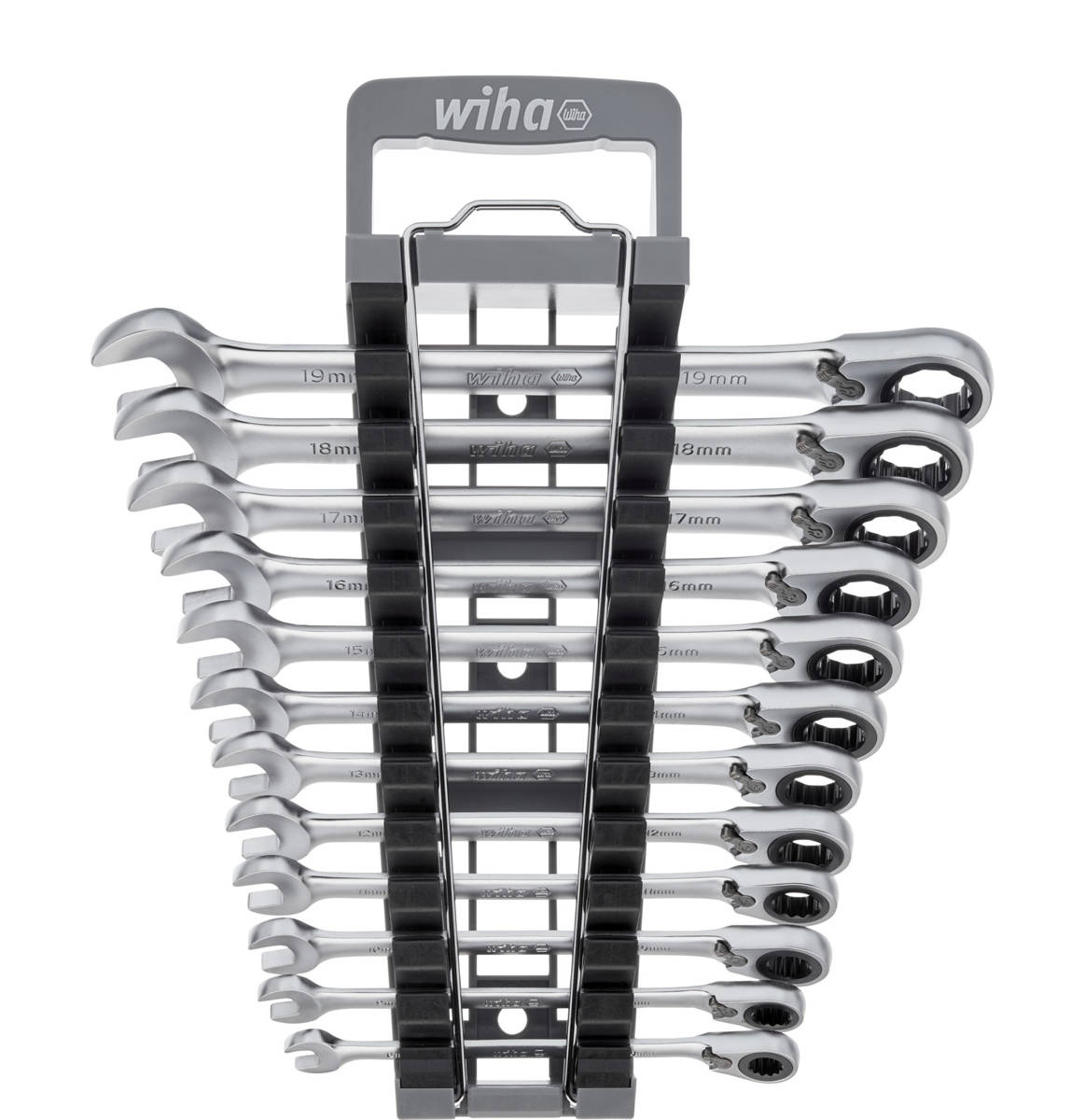 Zestaw kluczy płasko-oczkowych z grzechotką Wiha 44661 zaprojektowany i wykonany został w taki sposób, żeby mógł poradzić sobie z odkręcaniem mocno dokręconych śrub i nakrętek z wykorzystaniem zasady dźwigni. Ponadto końcówka szczękowa doskonale nadaje się do kontrowania śrub i nakrętek. Dzięki ułożeniu szczęki pod kątem 15° końcówka szczękowa idealnie nadaje się do prac w miejscach o ograniczonej przestrzeni. 72 zębowy mechanizm oraz sześciokątny kształt oczka zapewniają krótki kąt powrotu. Zestaw wyposażony jest w 12 kluczy w rozmiarach od 8 - 19 milimetrów.
