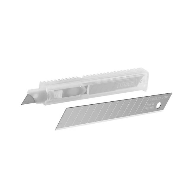Ostrze łamane Stanley 9mm 10szt. 0-11-300 to komplet 10 ostrzy wymiennych. Przeznaczone do noży z tego typu ostrzami. Ostrze jest 12 segmentowe, a jego szerokość wynosi 9 milimetrów. Zestaw obejmuje 10 ostrzy.