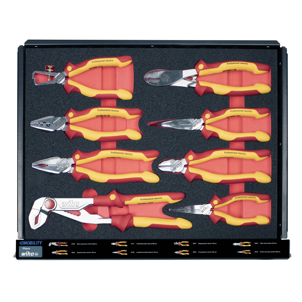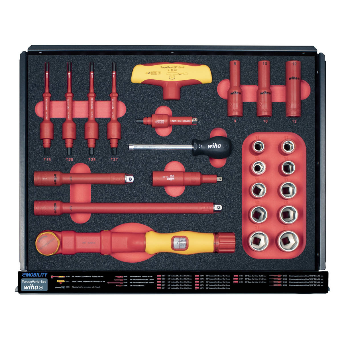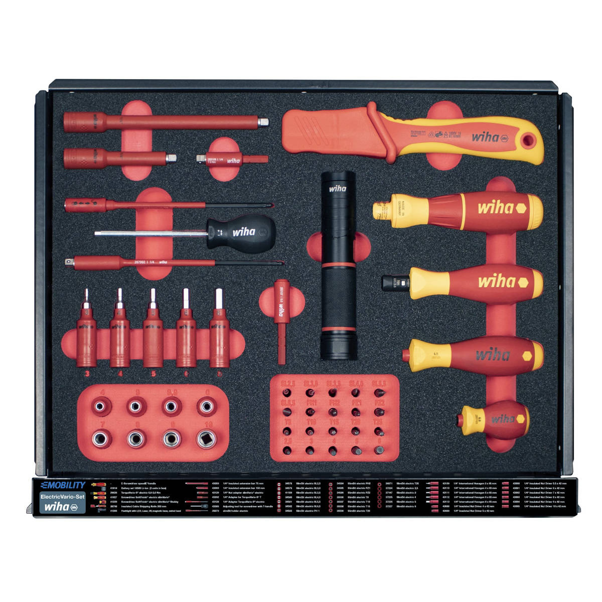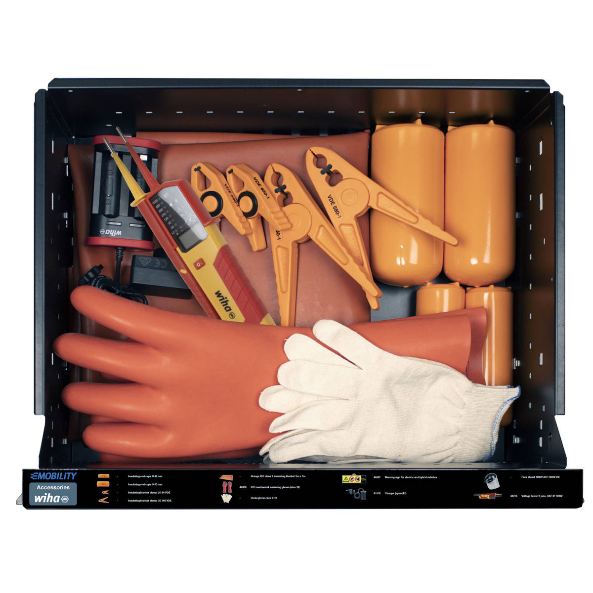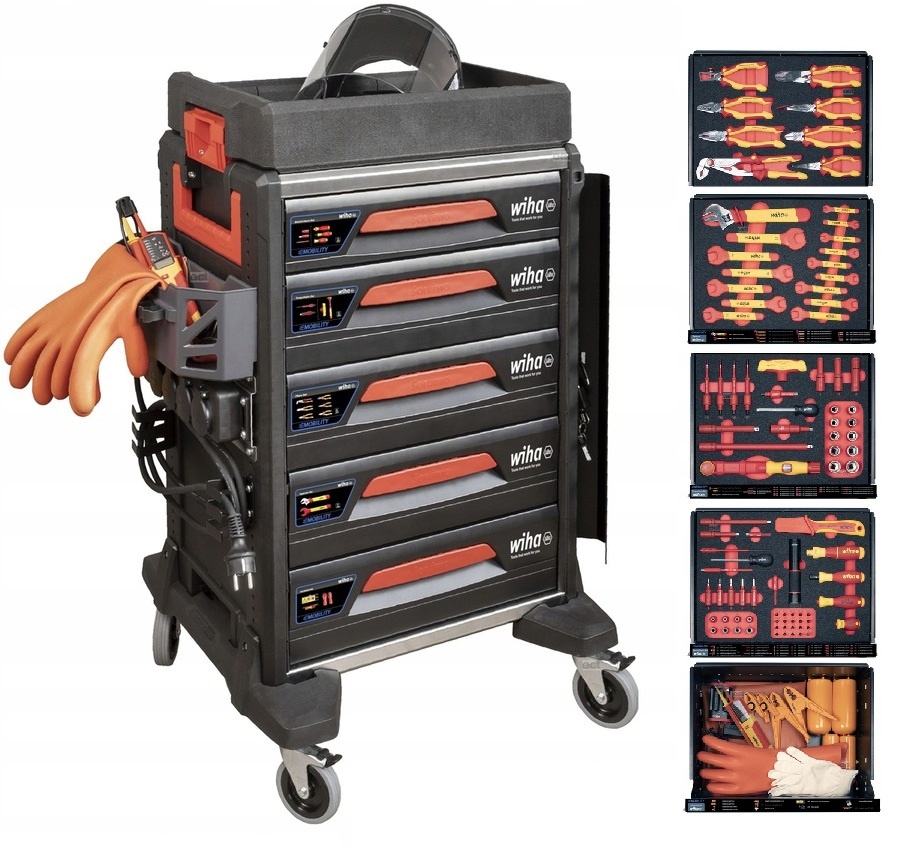 Wózek warsztatowy eMobility Wiha 44423 dedykowany jest do wykonywania prac naprawczych przy samochodach elektrycznych i hybrydowych. Prace przy takich pojazdach elektrycznym wymagają specjalnych wykwalifikowanych pracowników oraz bezpiecznych, certyfikowanych narzędzi. Wyposażenie wózka stanowią narzędzia ręczne wysokiej jakości, które dzięki kompaktowej formie przechowywania zawsze znajdują się pod ręką. Większość z narzędzi posiada izolację z certyfikatem VDE, dzięki czemu zapewniają bezpieczną pracę pod napięciem. Wózek narzędziowy podzielony jest na pięć szuflad, wypełnionych wkładami piankowymi, które pozwalają na uporządkowane przechowywanie narzędzi. Szuflady można całkowicie wysunąć, uzyskując nieograniczony i szybki dostęp do ich zawartości. Dzięki dodatkowej półce i wbudowanemu poczwórnemu gniazdku wózek można wyposażyć także w narzędzia elektryczne.