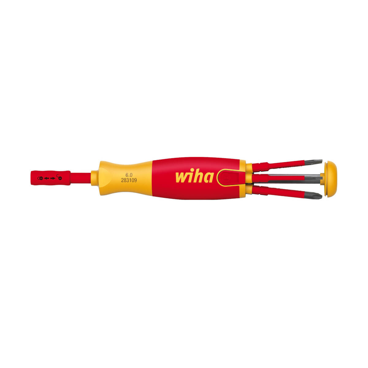 Wkrętak z magazynkiem bitów LiftUp electric Wiha 41235 to doskonałe narzędzie każdego elektryka wykonującego mobilne zlecenia i nie tylko. Umieszczony w rękojeści schowek na 6 najczęściej używanych bitów typu slimBit wysuwa się z magazynka po naciśnięciu przycisku. Sprawdzony uchwyt ClicFix mieści bezpiecznie wszystkie bity i niezawodnie je blokuje. Technologia ta czyni z magazynku bitów uniwersalny wkrętak. Zarówno uchwyt na bity z magazynkiem, jak i wchodzące w jego skład bity typu slimBit posiadają certyfikat zgodny z międzynarodową normą IEC 60900. Smukłe bity typu slimBit o długości 75 mm umożliwiają dzięki całkowicie zintegrowanej z przednią częścią izolacji ochronnej doskonały dostęp do głęboko osadzonych zacisków śrubowych lub sprężynowych. Umieszczony w rękojeści obrotowy kapturek zapewnia