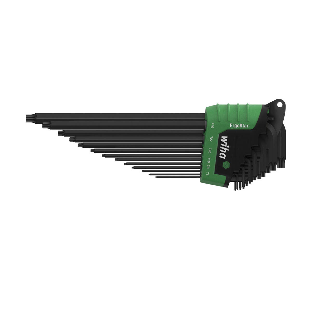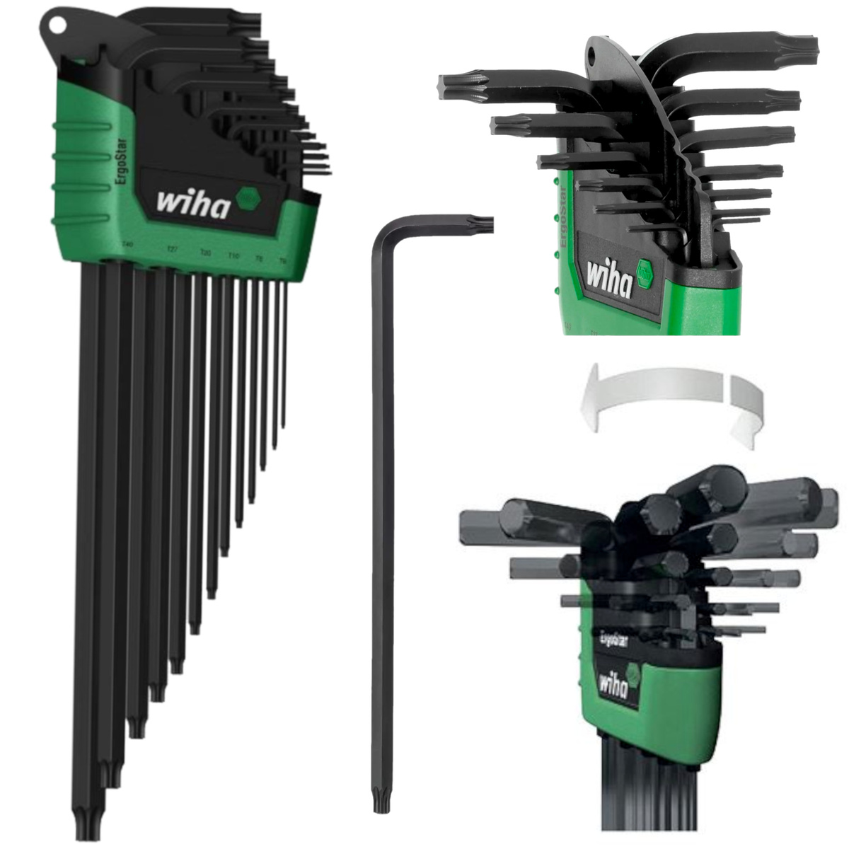 Zestaw kluczy trzpieniowych w uchwycie ErgoStar Wiha 43848 składa się z trzynastu obustronnych kluczy sześciokątnych TORX, w rozmiarach T5 -T45 umieszczonych w praktycznym etui z tworzywa sztucznego, wyposażonemu w mechanizm ułatwiający ich wyjmowanie oraz wkładanie. Obrócenie jednego z kluczy w uchwycie sprawia, że wszystkie pozostałe klucze obracają się w bok pod tym samym kątem, dzięki czemu ich wyjmowanie jest dziecinnie proste. Ponadto kolorowe klucze dzięki pokryciu lakierem luminescencyjnym można szybko i łatwo odnajdywać nawet w ciemności za pomocą lampy UV.