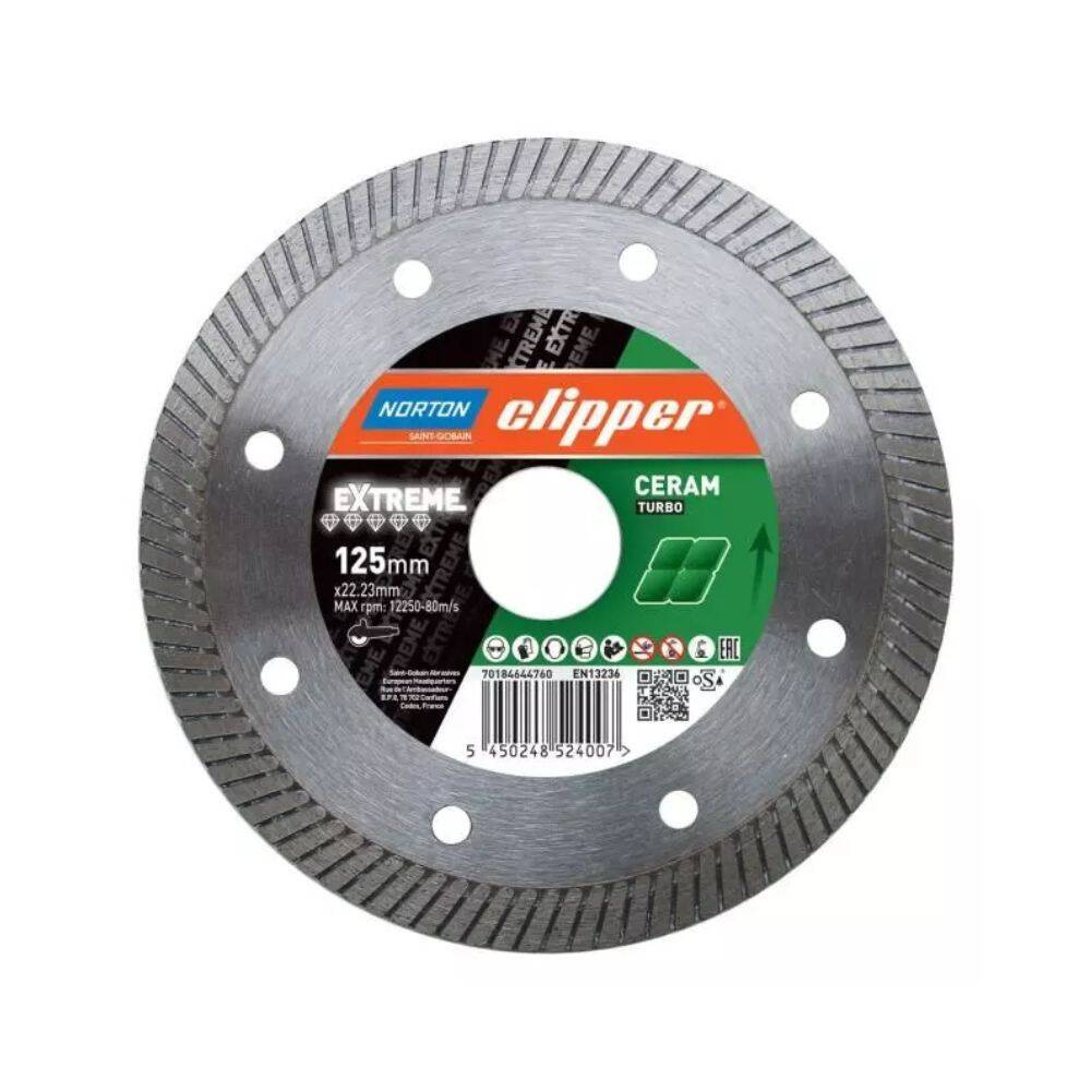 Tarcza diamentowa Extreme Ceramic Turbo Norton Clipper 70184621970 została stworzona do cięcia najtwardszych płytek ceramicznych oraz porcelanowych. Ponadto można nią również przecinać marmur, terakotę, granit i wiele innych twardych materiałów. Osprzęt może zostać zamontowany na szlifierkach kątowych, przecinakach do glazury oraz przecinakach do wyrobów murarskich. Segmenty o długości 10 mm tworzą linię ciągłą, która sprawia, że cięcia są wykonywane z wysoką jakością. Ponadto dzięki temu, że tarcza jest wąska, stary materiału są minimalizowane.