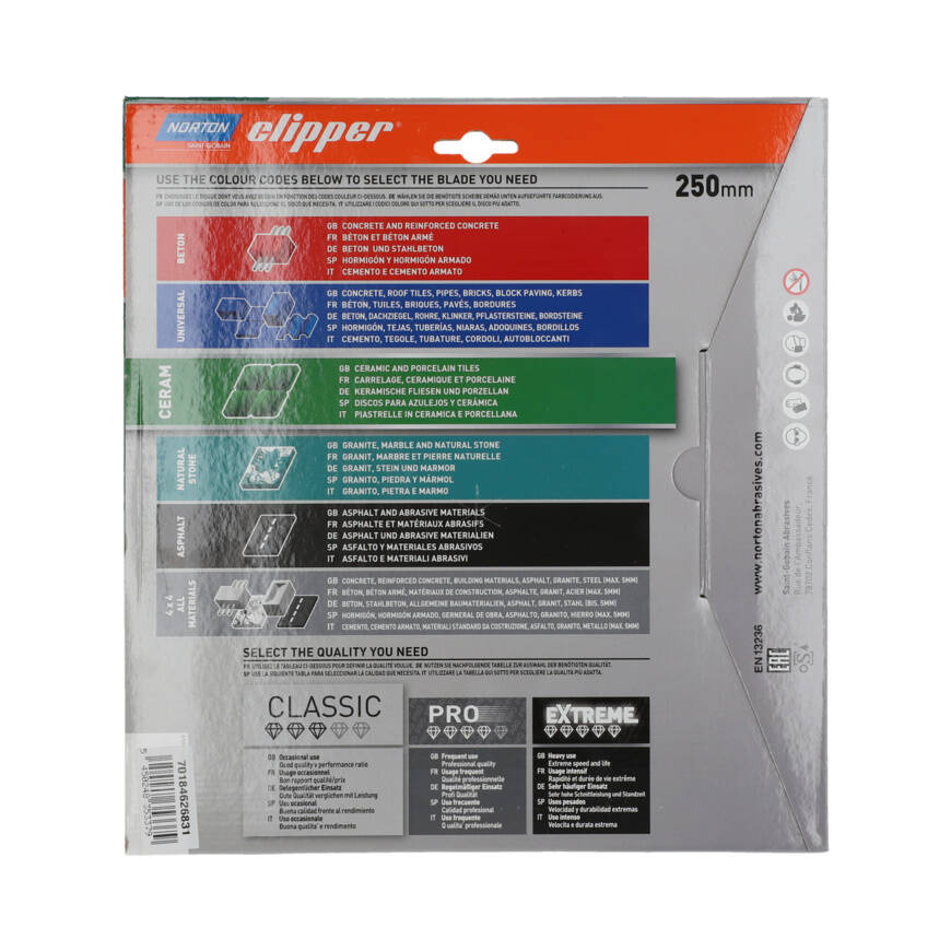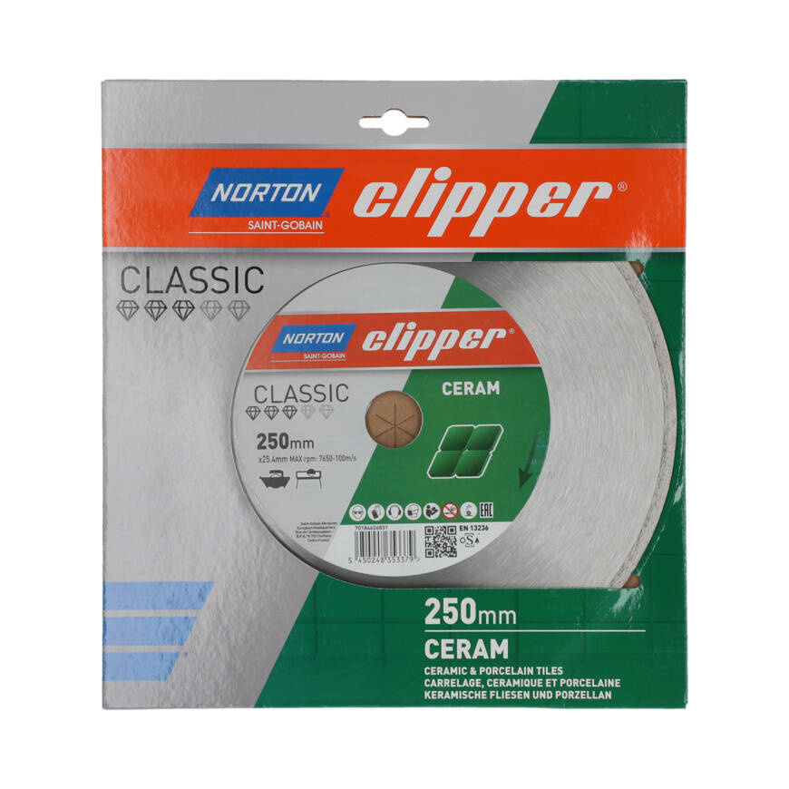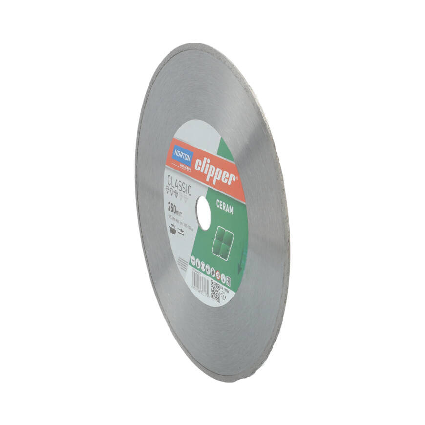 Tarcza diamentowa Norton 70184626831 to tarcza diamentowa o średnicy 250 mm i średnicy wewnętrznej 25,4 mm, przystosowana do pracy z ceramiką przy przecinarkach do glazury.