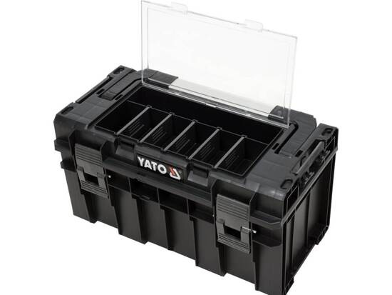 Skrzynka narzędziowa P45P S1 Yato YT-09183 to ergonomiczna i zamykana skrzynka, która umożliwia wygodne przechowywanie oraz przenoszenie narzędzi i drobnych elementów. Dzięki modułowej konstrukcji, skrzynka może być łączona z innymi skrzynkami tego samego typu, umożliwiając przenoszenie 2 lub 3 sztuk jednocześnie. Dodatkowo, może stać się częścią zestawu systemowych skrzynek o numerach katalogowych YT-09162 lub YT-09166. Produkt ten jest idealny dla profesjonalistów oraz pasjonatów majsterkowania, którzy potrzebują niezawodnego rozwiązania do przechowywania i transportu narzędzi​.